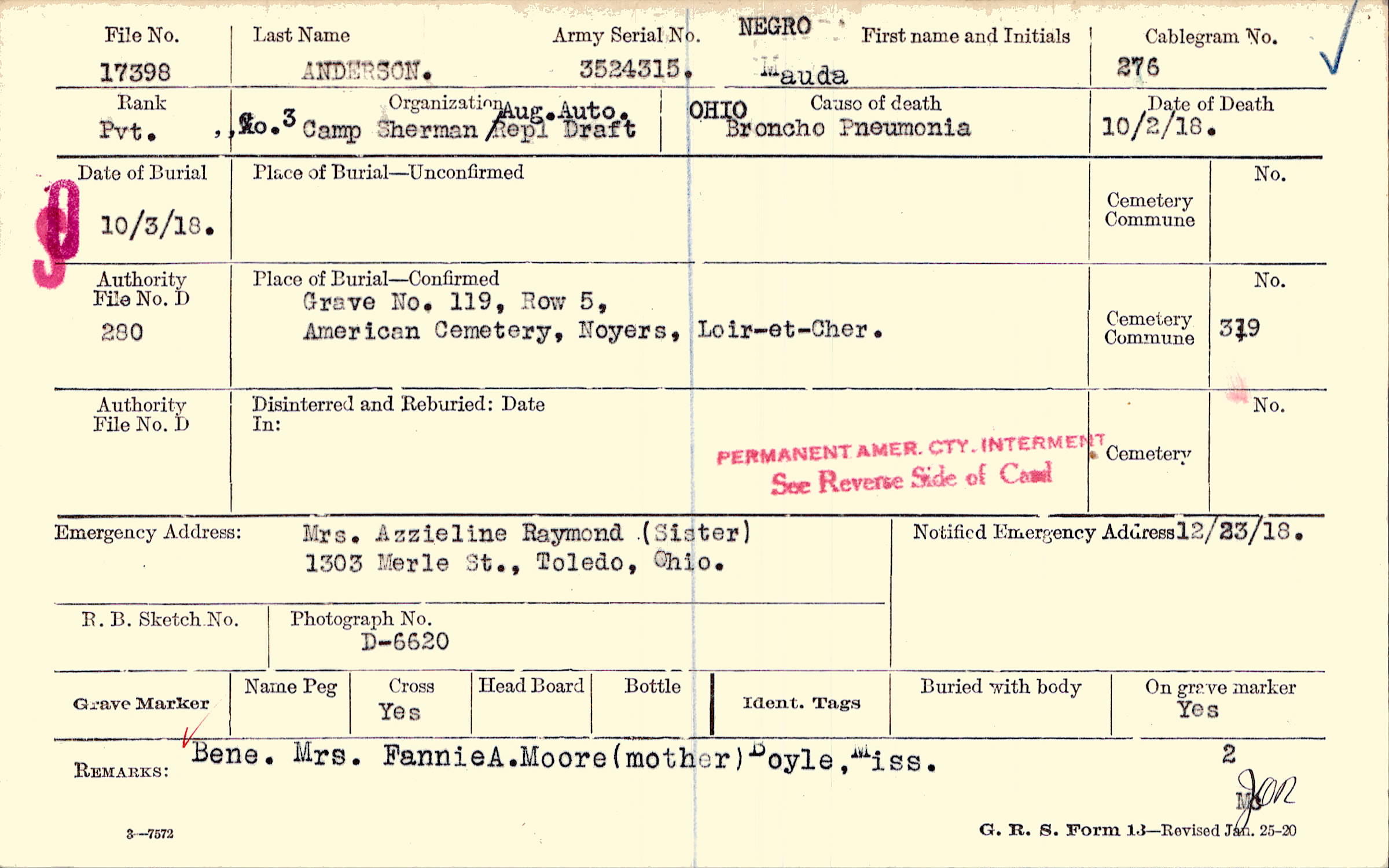 Mrs. Azzieline Raymond (Sister), 1303 Merle St., Toledo, Ohio.