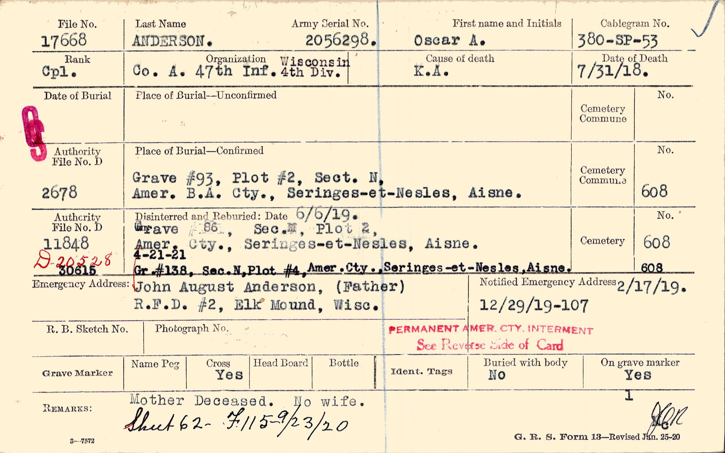 John August Anderson, (Father), R.F.D. #2, Elk Mound, Wisc.