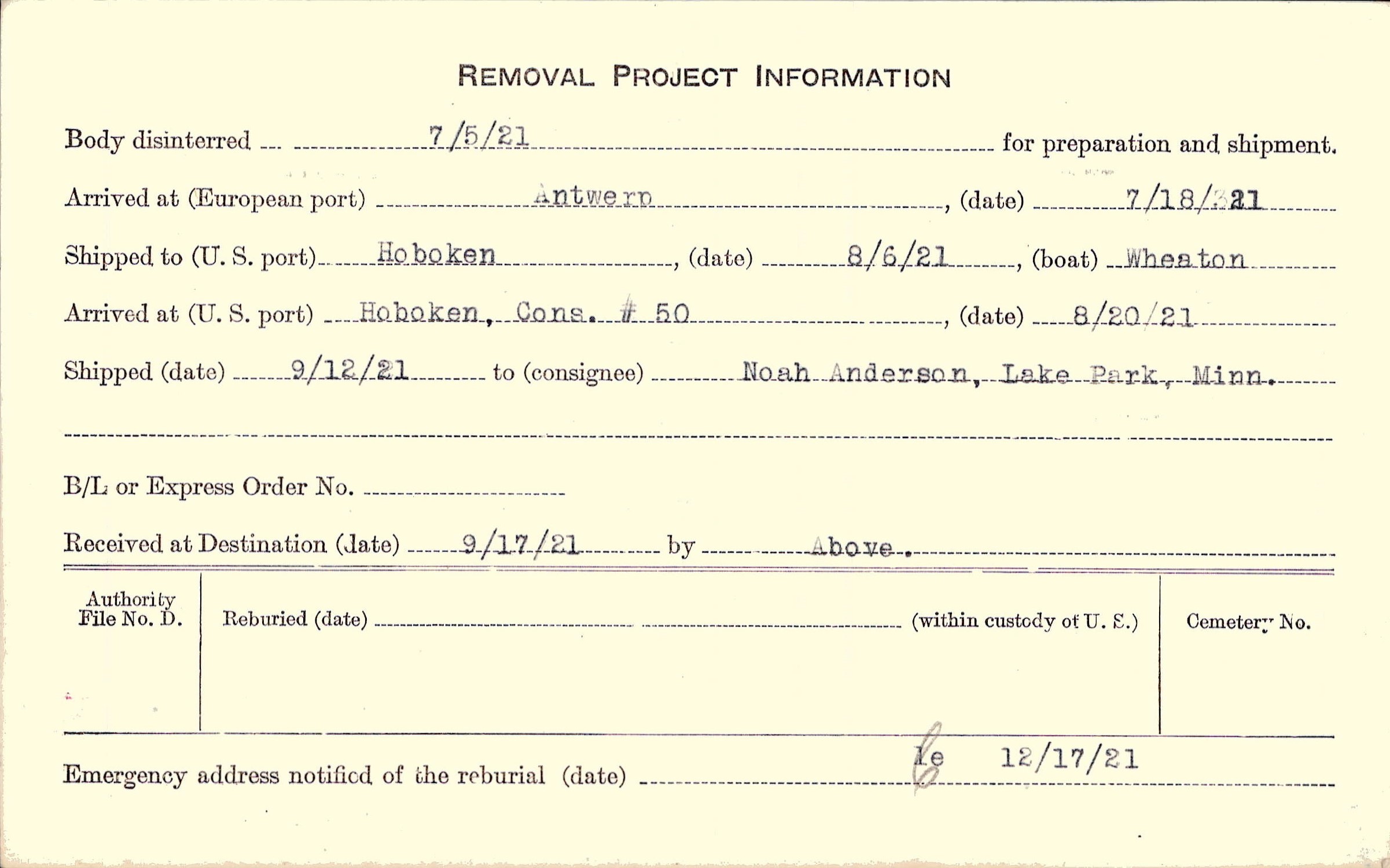 Body disinterred 7/5/1921 for preparation and shipment.
