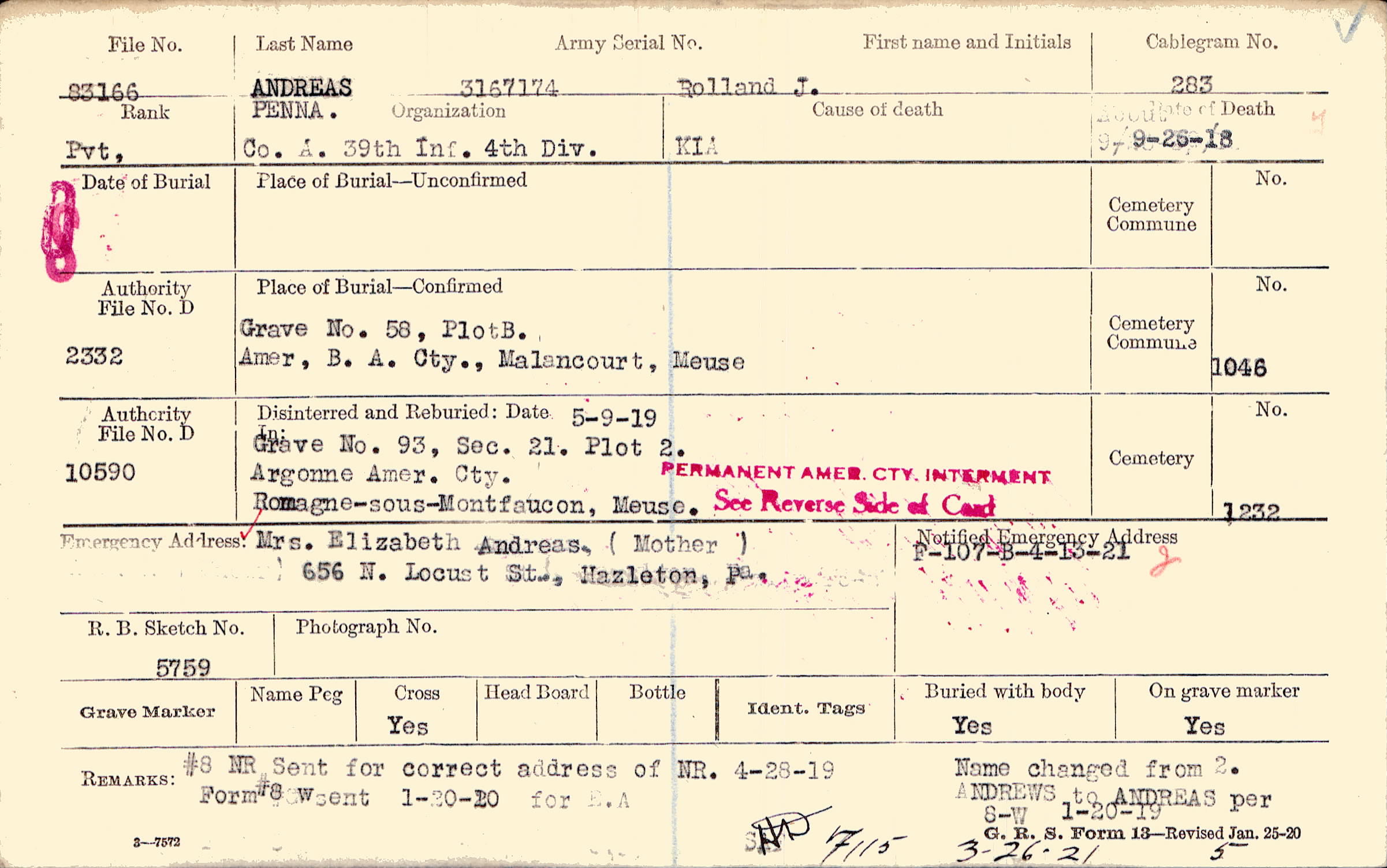 #8 NR Sent for correct address of NR. 4-28-19 Form #8 w sent 1-20-20 for E.A. Name changed from ANDREWS to ANDREAS per 8-W 1-20-19, 3/26/1921
