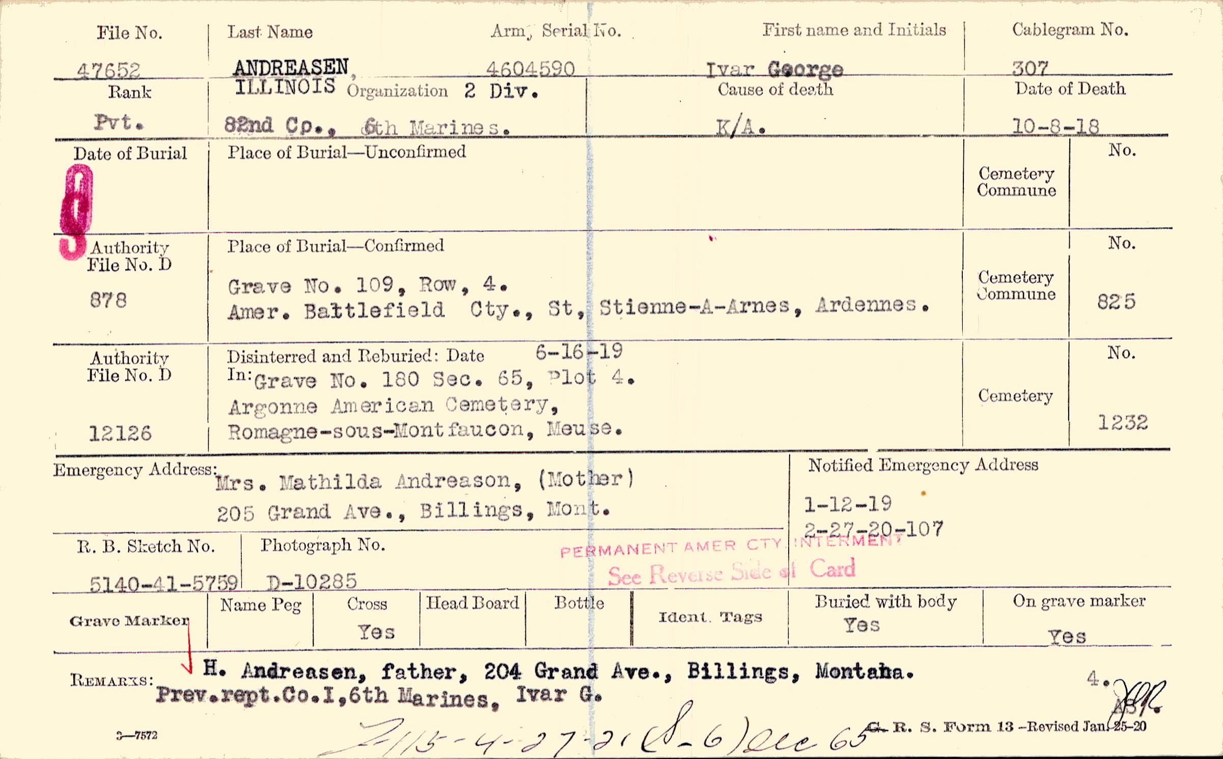 H. Andreasen, father, 204 Grand Ave., Billings, Montana. Prev. rept. Co. I, 6th Marines, Ivar G., F115 - 4-27-21 (S-6) sec 65