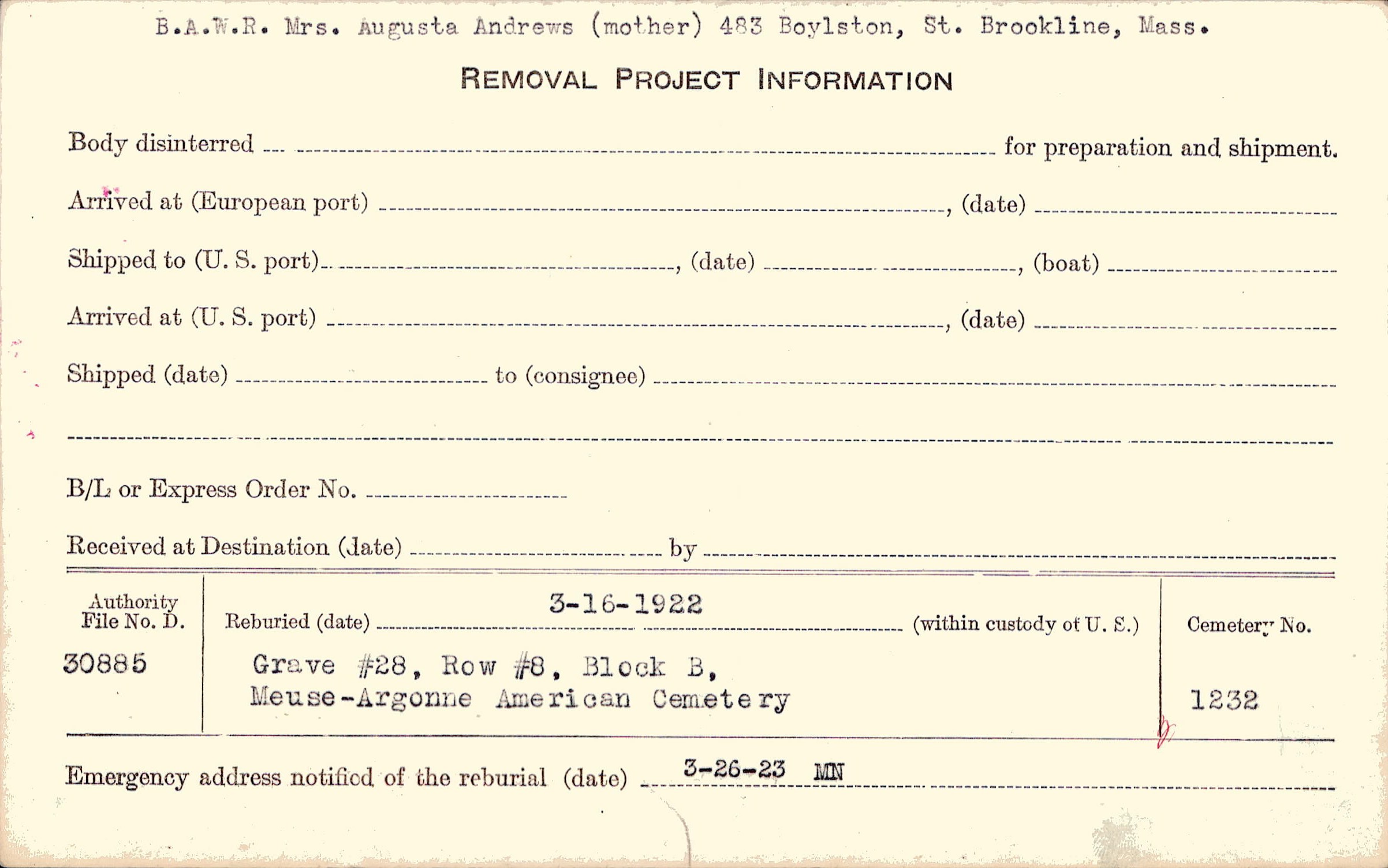 B.A.W.R. Mrs. Augusta Andrews (mother) 483 Boylston, St. Brookline, Mass. |