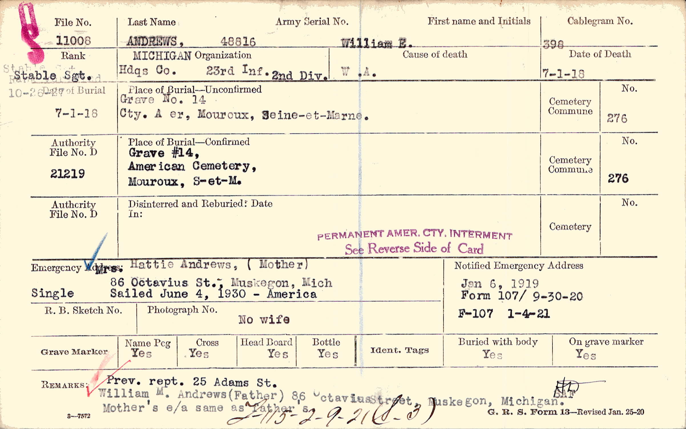 Prev. rept. 25 Adams St. William M Andrews (Father), 26 Octavius Street, Muskegon, Michigan Mother's e/a same as father's, F-115-2-9-21 (S-3)