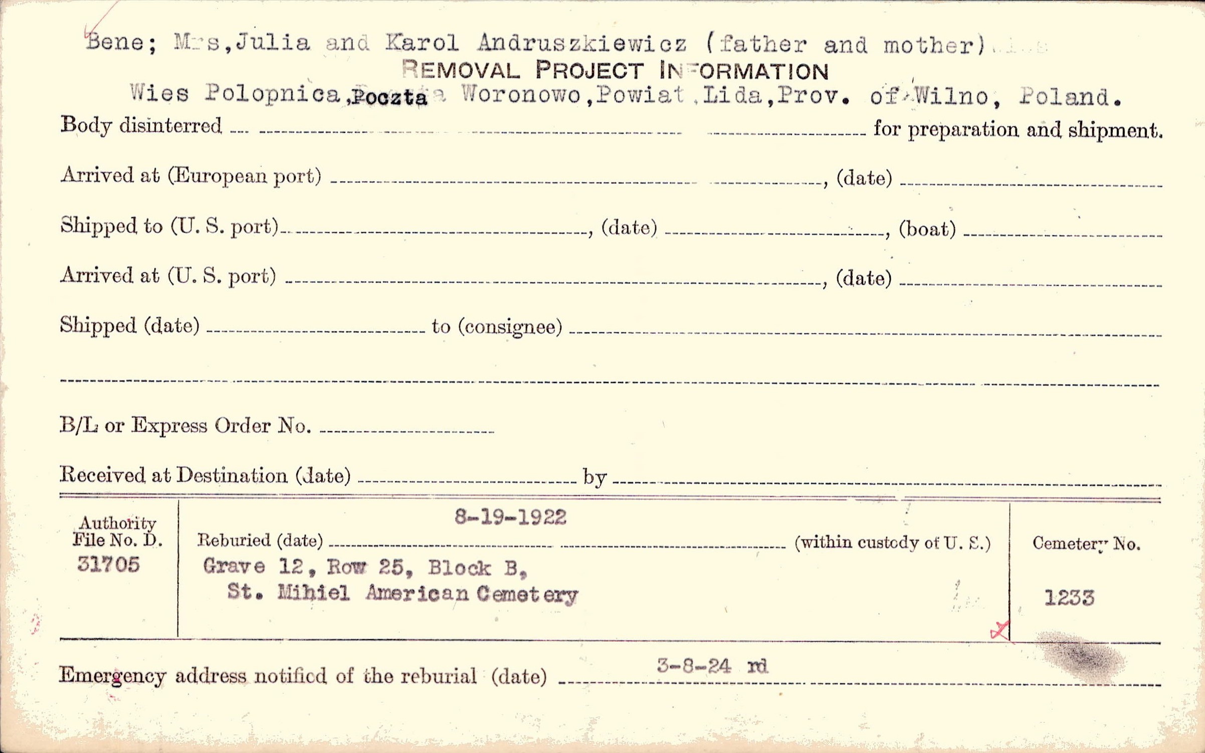 Bene; Mrs. Julia and Karol Andruszkiewicz (father and mother), Wies Polopnica, Poczta Woronowo, Powiat, Lida, Prov. of Wilno, Poland |