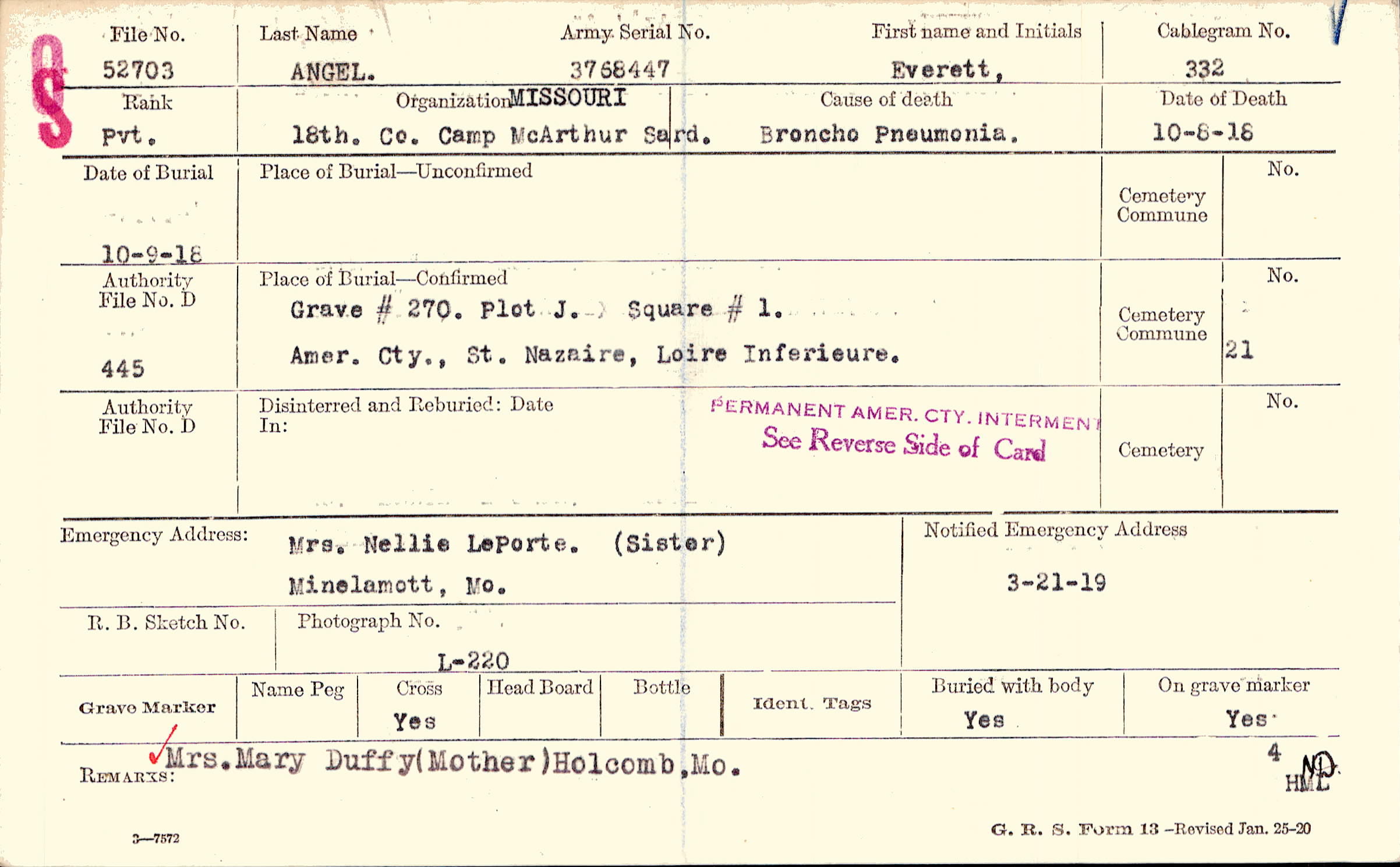 Grave # 270, Plot J., Square #1., Amer. Cty., St. Nazaire, Loire Inferieure.