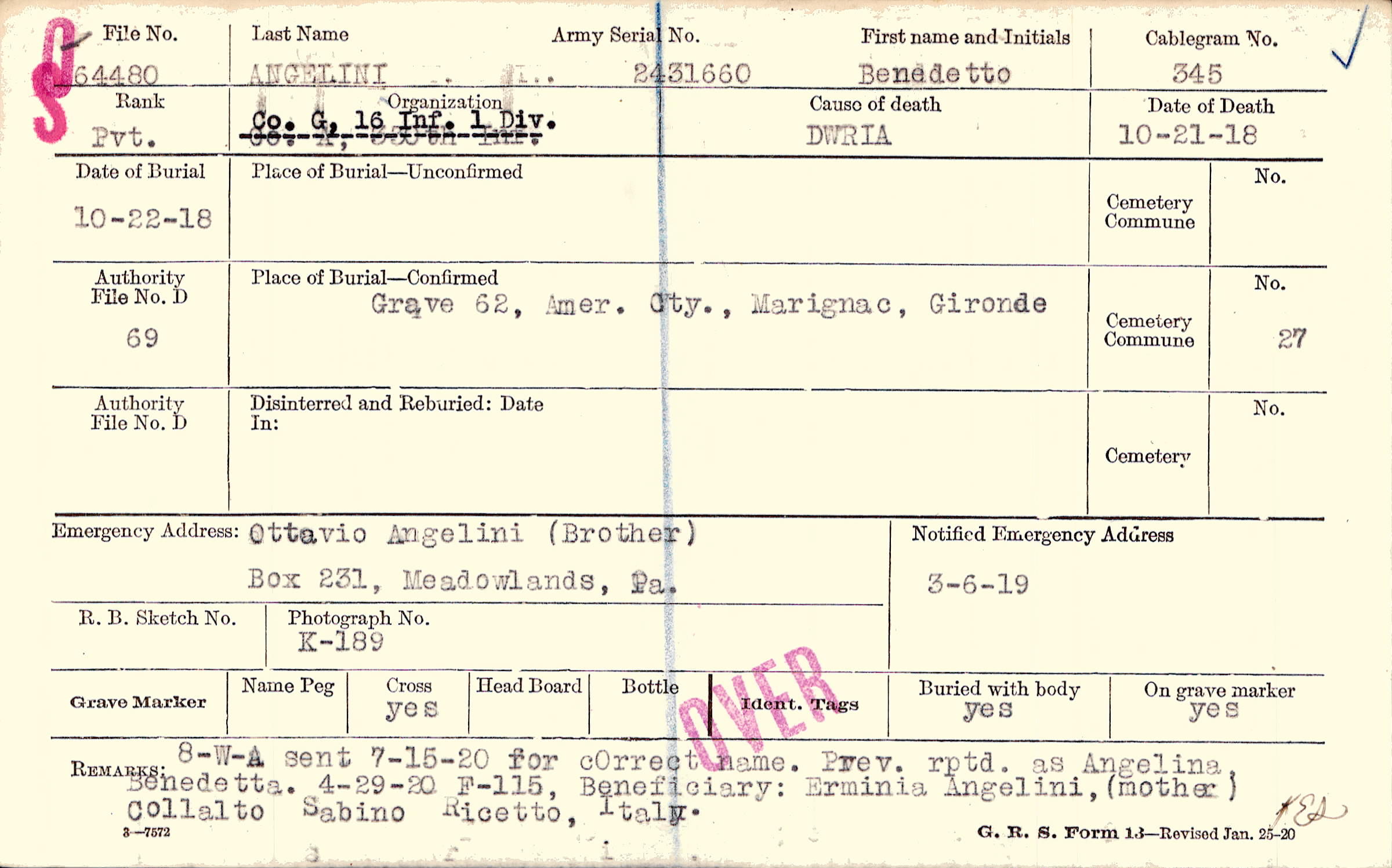 Ottavio Angelini (Brother), Box 231, Meadowlands, Pa., 8-W-a sent 7-15-20 for correct name. Prev. rptd. as Angelina Benedetta 4-29-20 F-115, Beneficiary: Erminia Angelini, (mother) Collato Sabino Ricetto, Italy