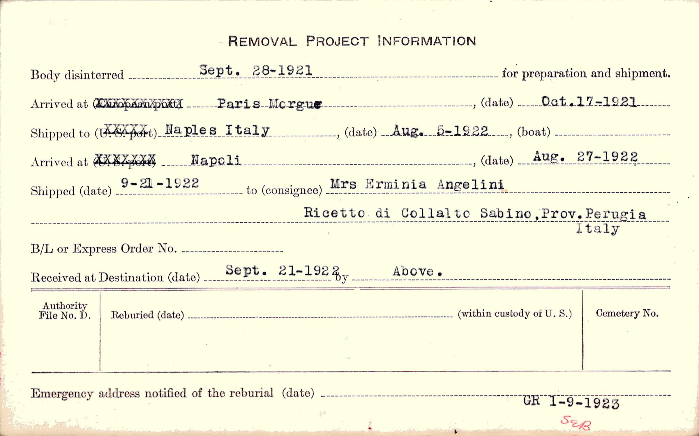 Body disinterred 9/28/1921 for preparation and shipment.