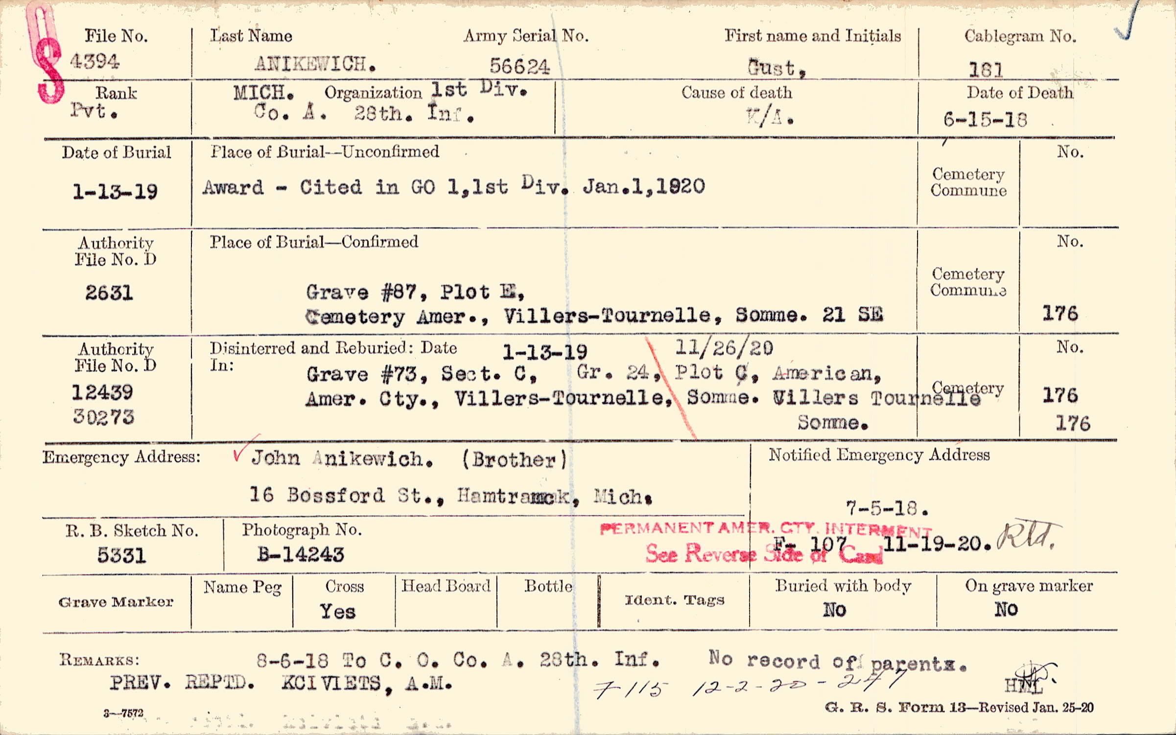 8-6-18 To C. O. Co. A. 28th. Inf. No record of parents. PREV. REPTD. KCIVIETS, A.M., F115 12-2-20 - 247