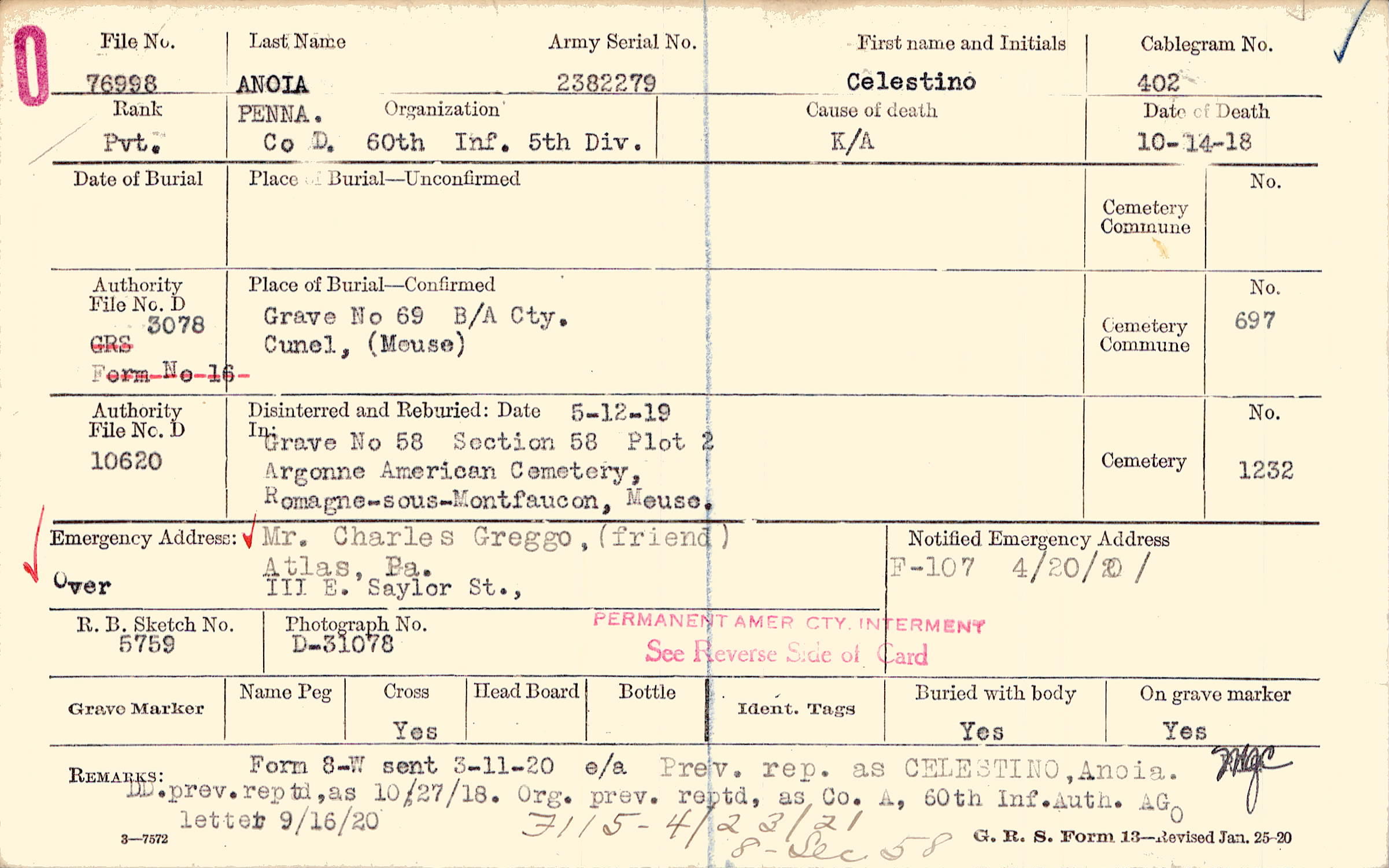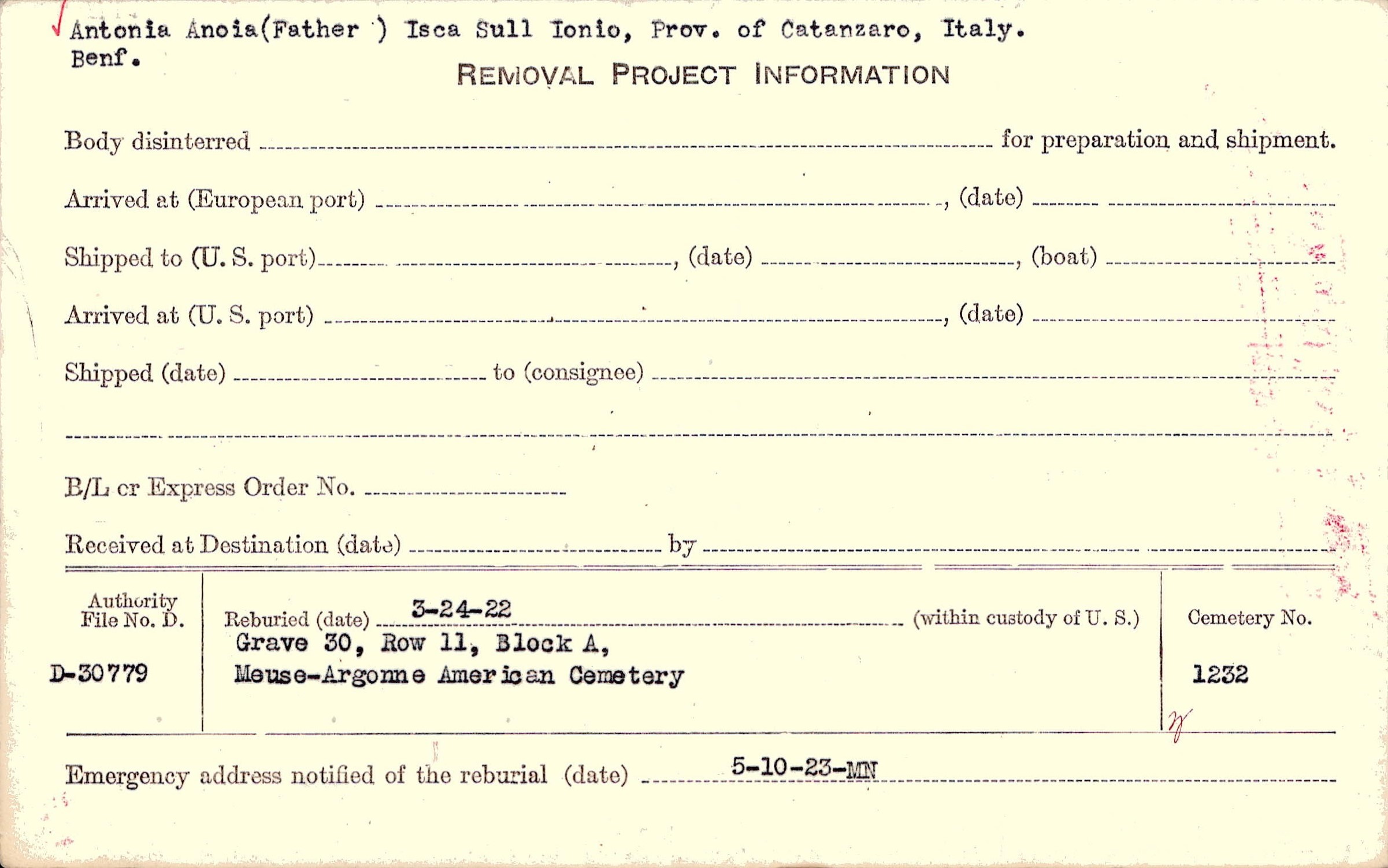 | Permanent Burial in Foreign Cemetery |