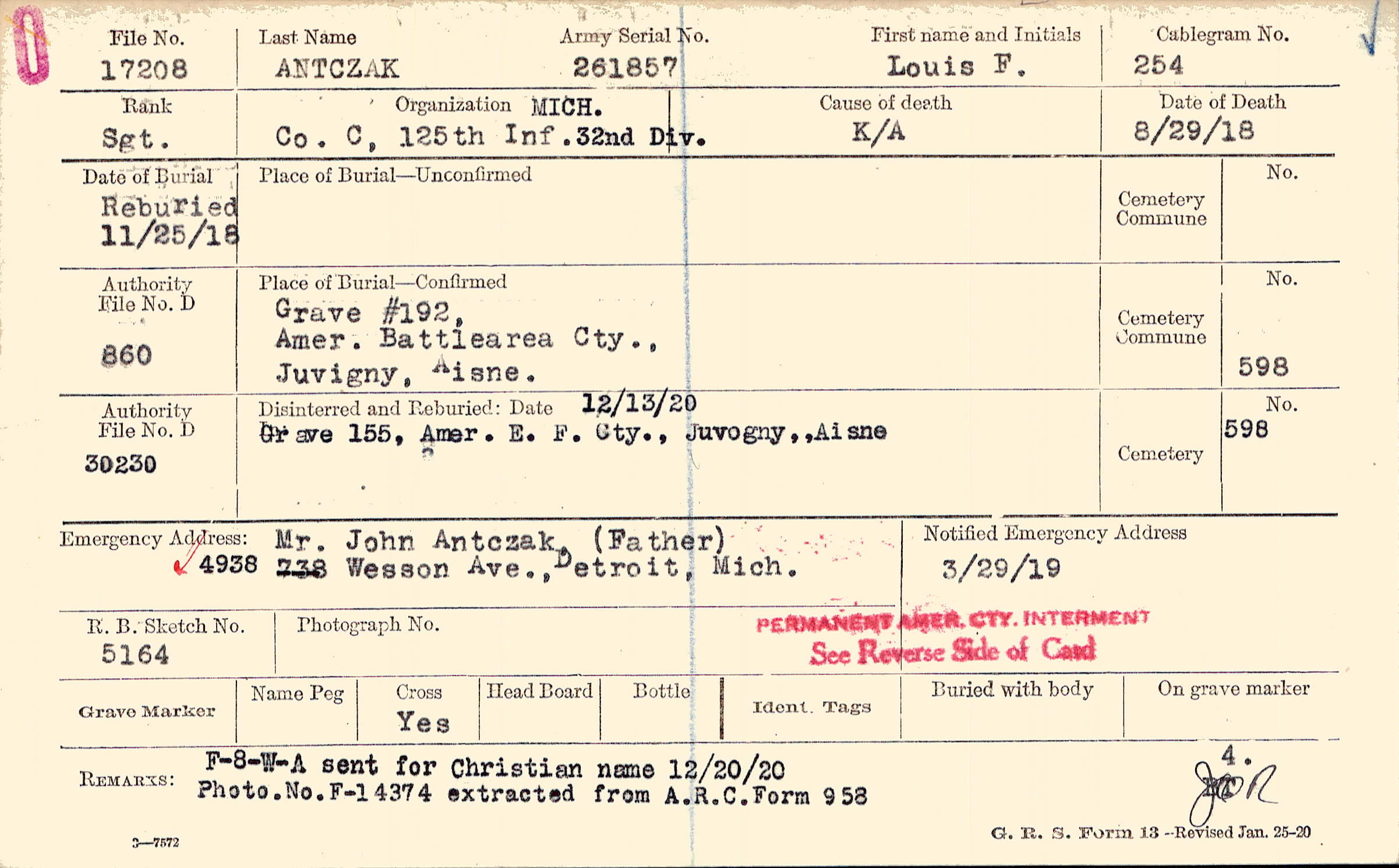 Mr. John Antczak, (Father), 4938 Wesson Ave., Detroit, Mich.