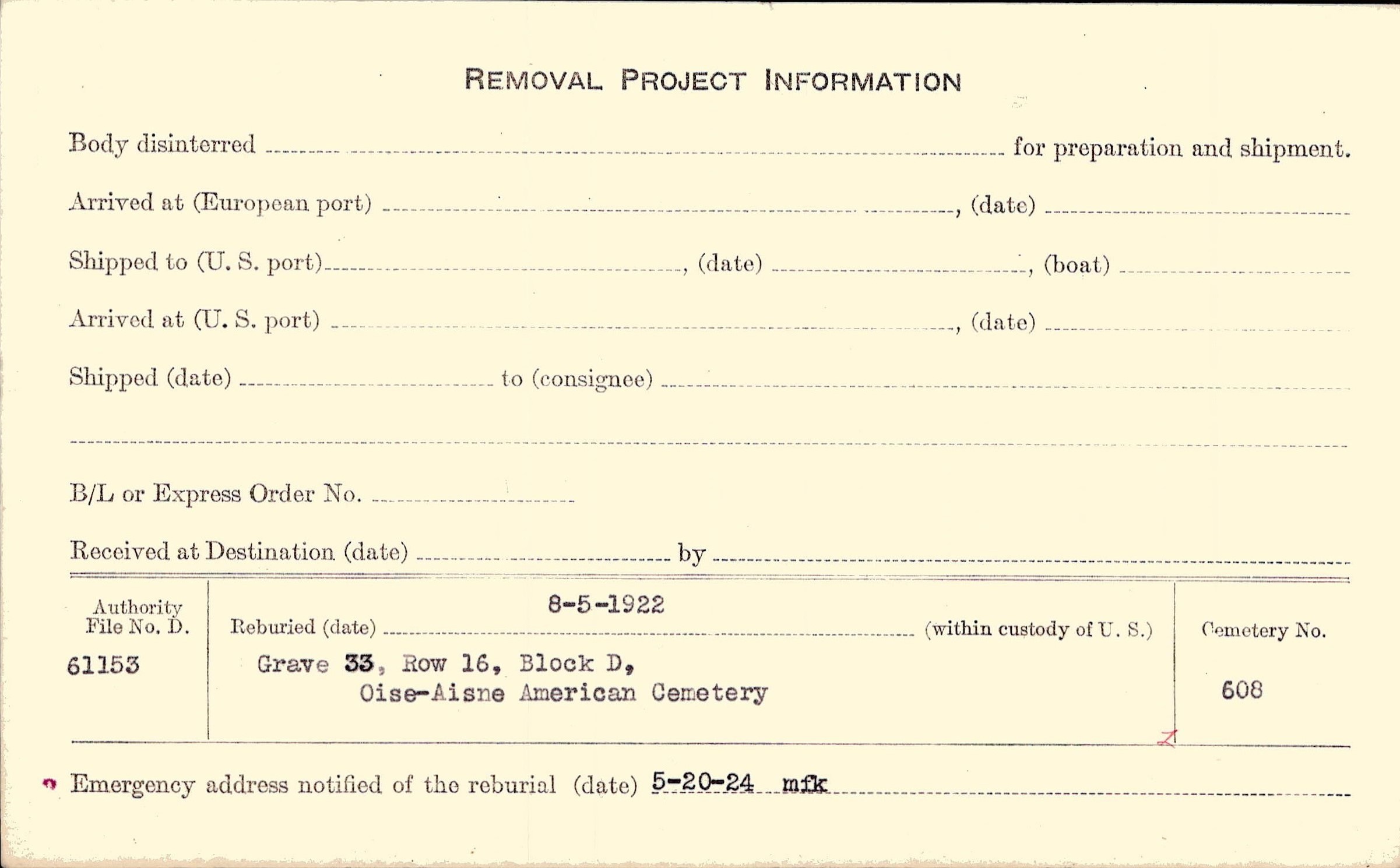Grave #192, Amer. Battlearea Cty. , Juvigny, Aisne.
