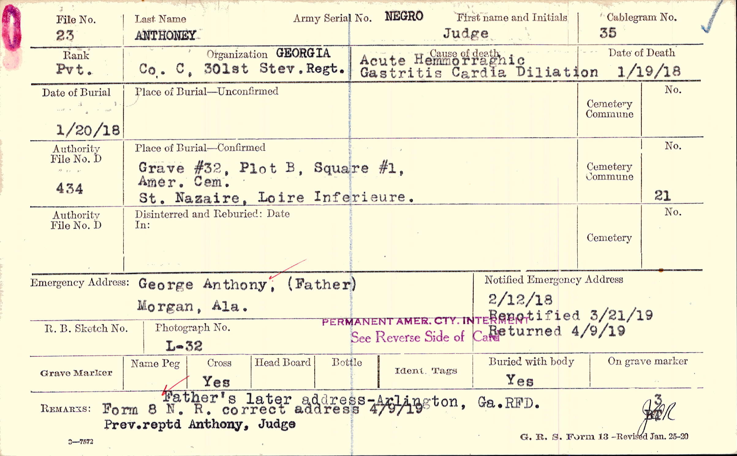Father's later address-Arlington, Ga. RFD. Prev. reptd Anthony, Judge, Form 8 N. R. correct address 4/9/19