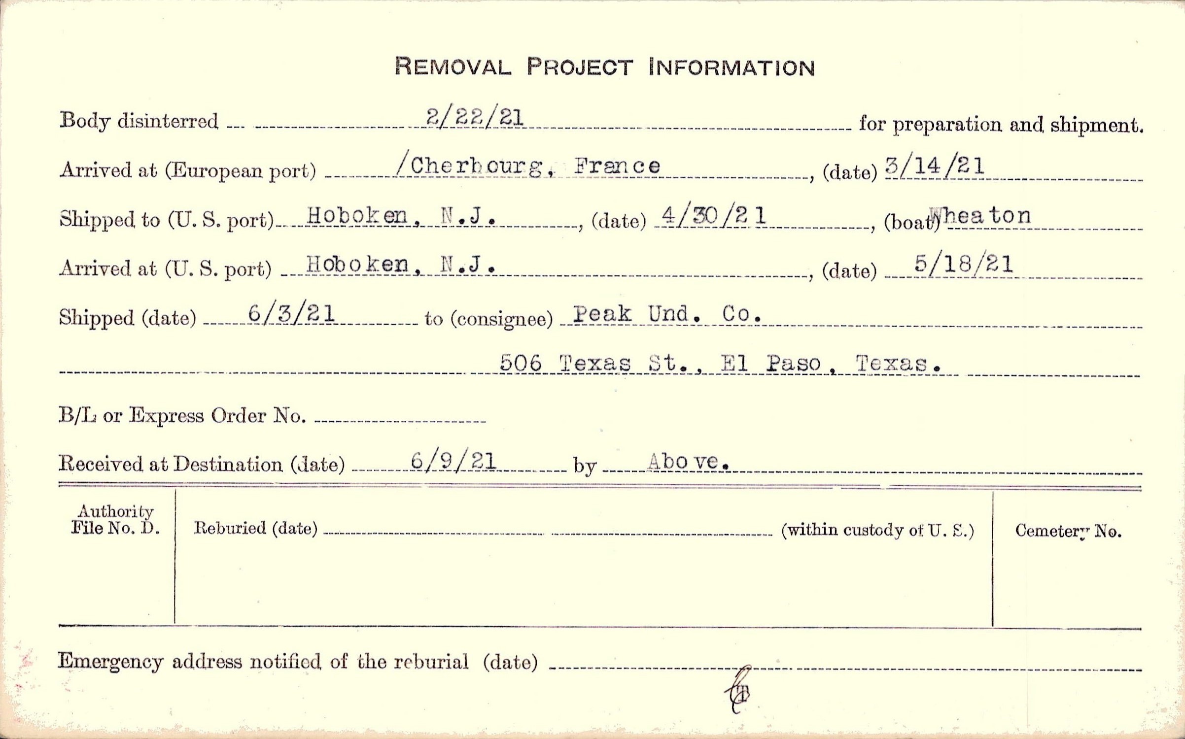 Body disinterred 2/22/1921 for preparation and shipment.