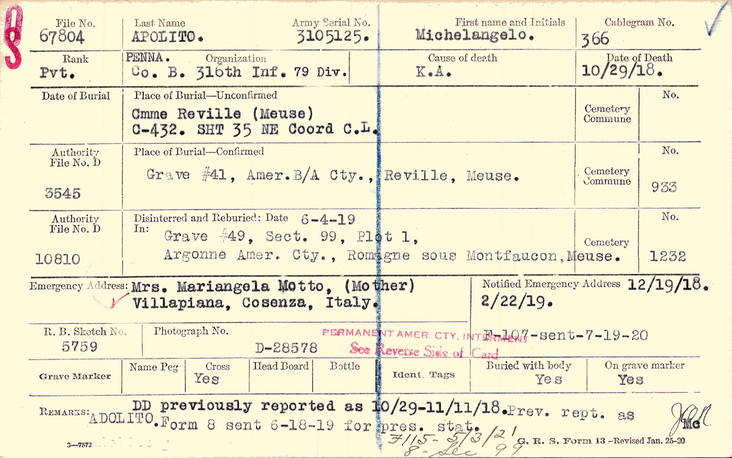 12/19/1918, 2/22/1919, Form 107: sent 7/19/1920