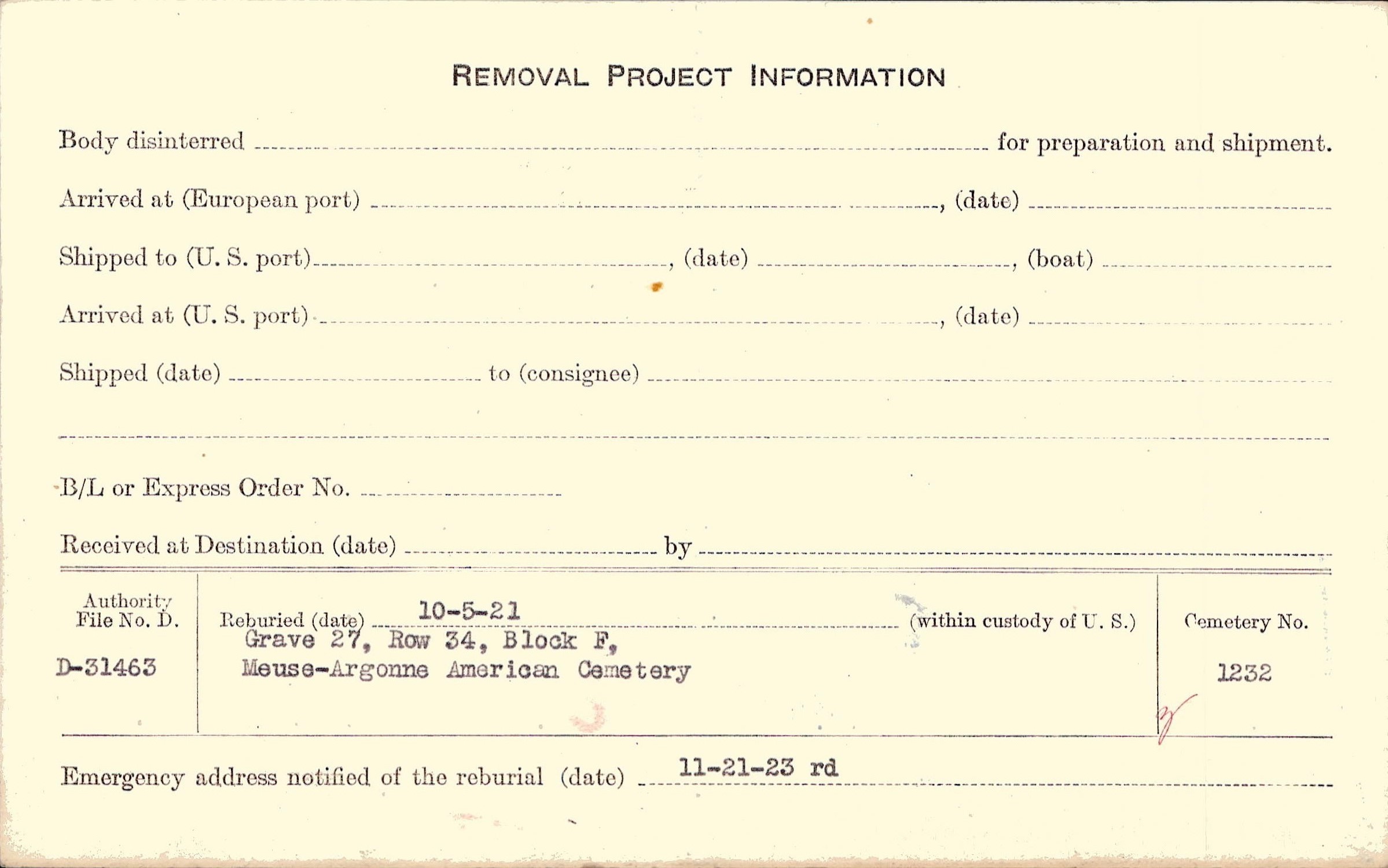 | Permanent Burial in Foreign Cemetery |