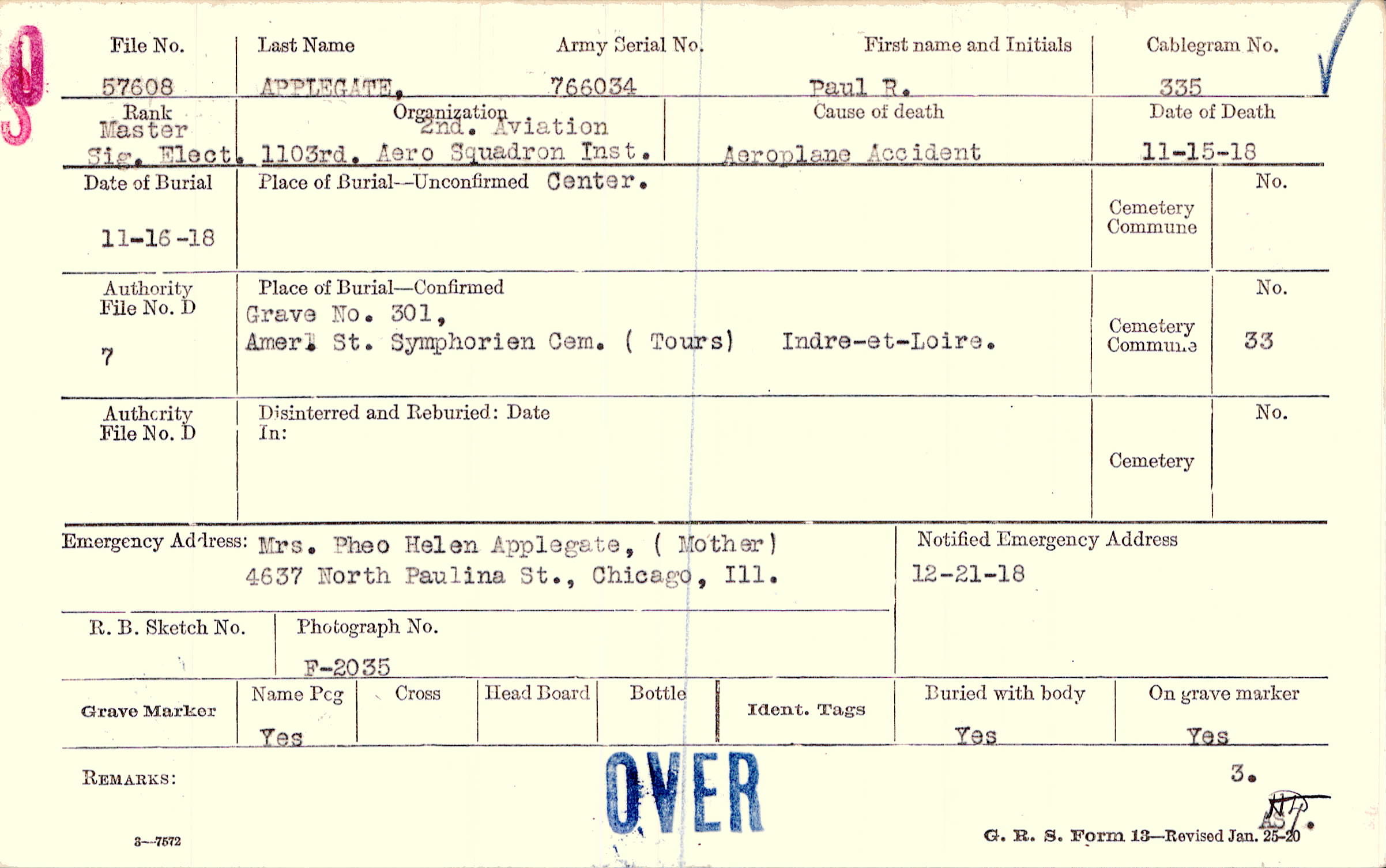 Grave 301,Amer. St. Symphorien Cem., Tours, Indre-et-Loire.