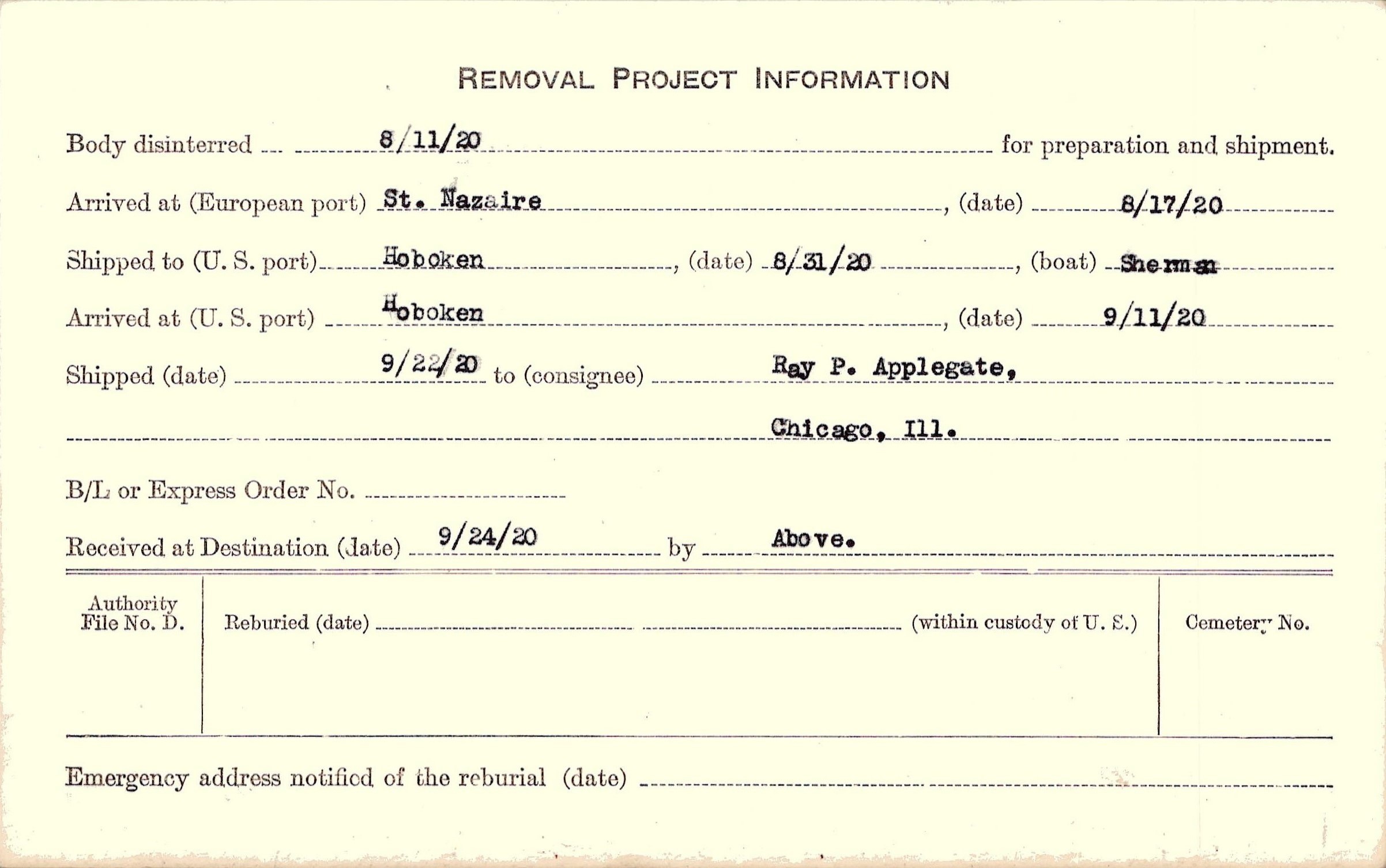 Body disinterred 8/11/1920 for preparation and shipment.