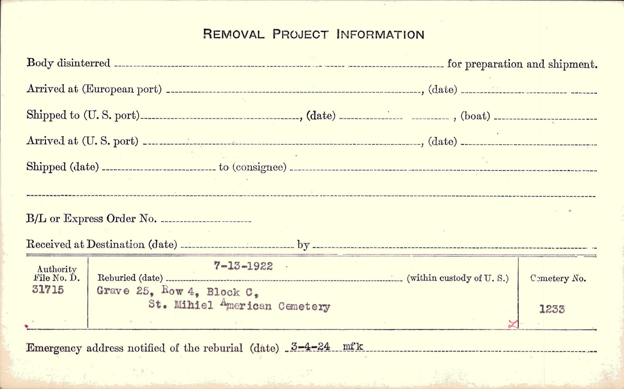 | Permanent Burial in Foreign Cemetery |