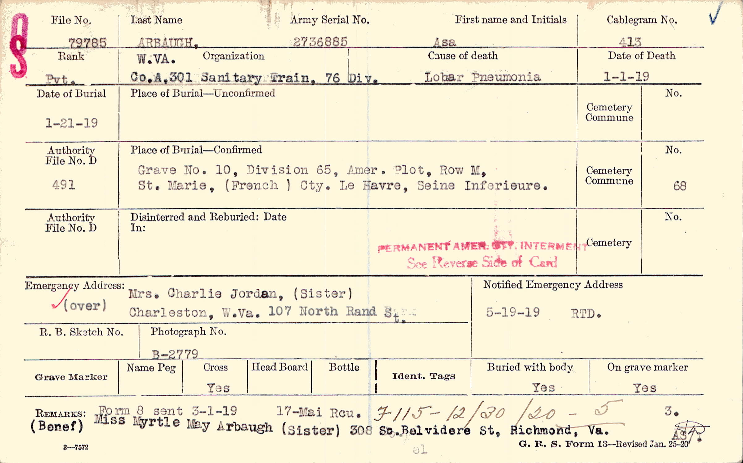Form 8 sent 3-1-19 17-Mai Rcu. (Benef) Miss Myrtle May Arbaugh (Sister) 308 So. Belvidere st., Richmond, Va.., F115 - 12/30/20 - 5