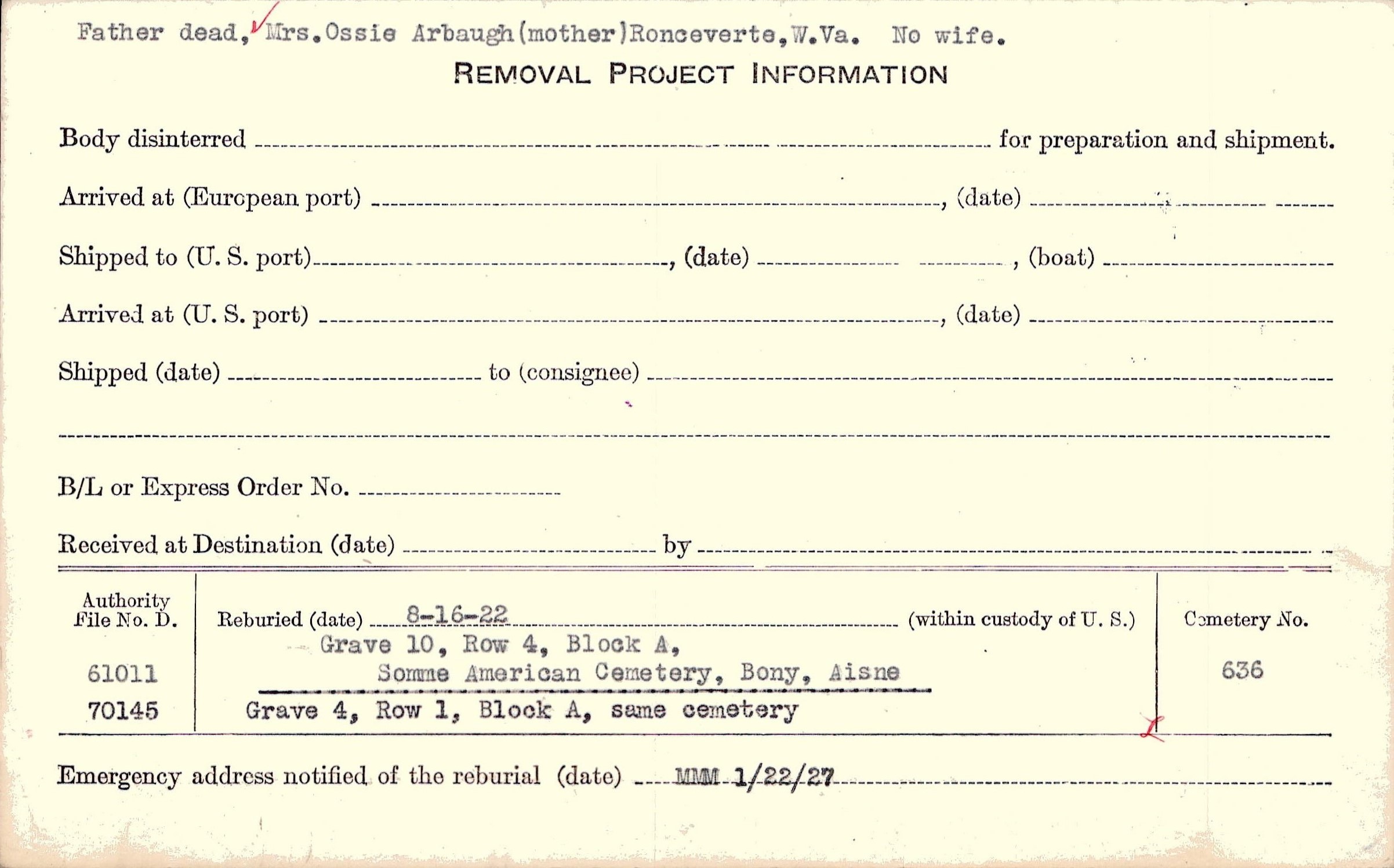 Father dead, Mrs. Ossie Arbaugh (mother) Ronceverte, W.Va., No wife |