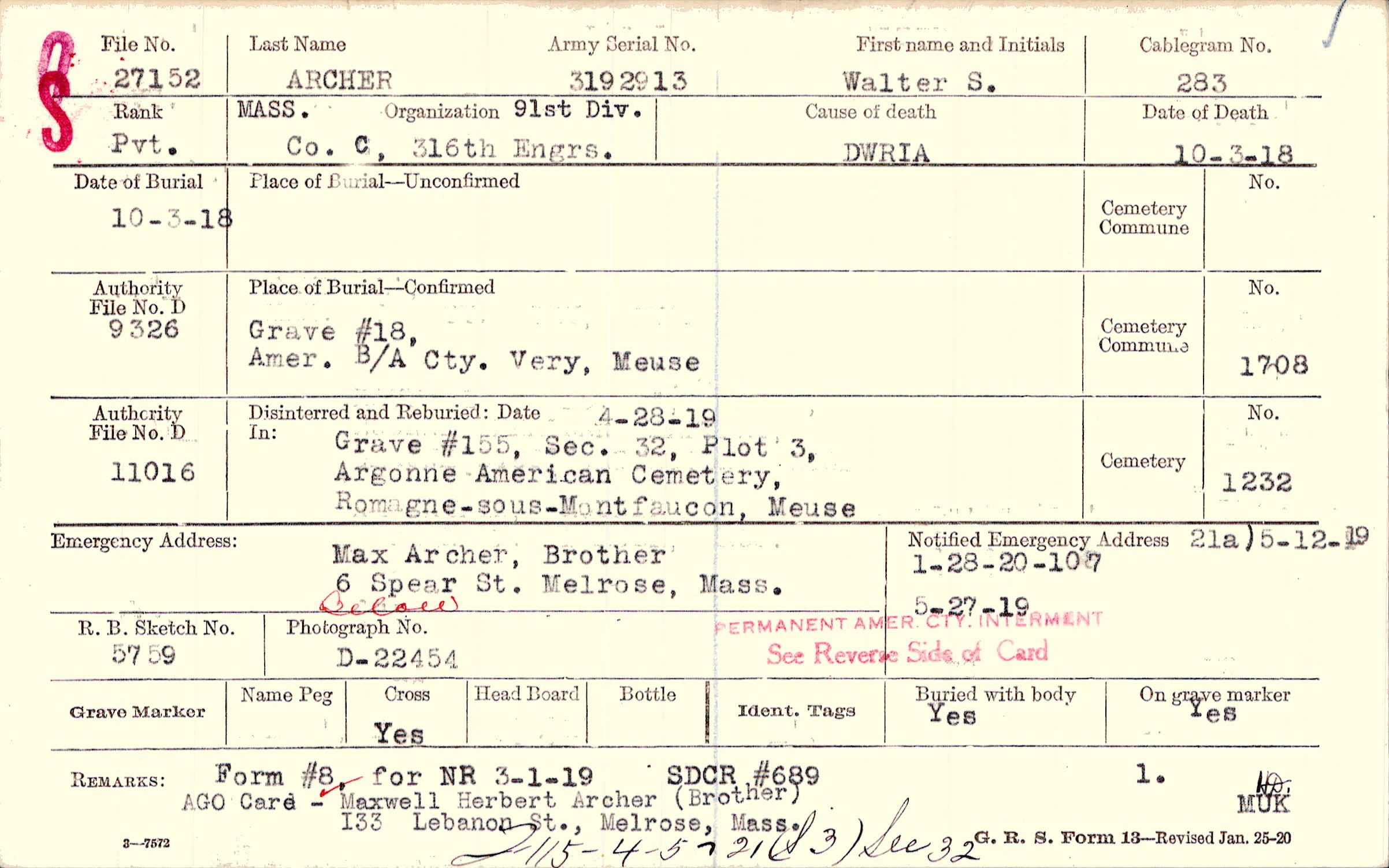 AGO card - Maxwell Herbert Archer (Brother) 133 Lebanon St., Melrose, Mass., Form #8, for NR 3-1-19, F115-4-5-21 (S3) Sec 32, SDCR #689