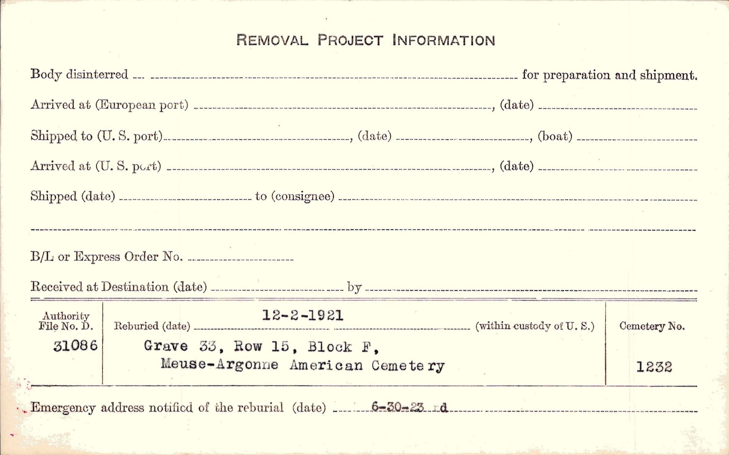 | Permanent Burial in Foreign Cemetery |