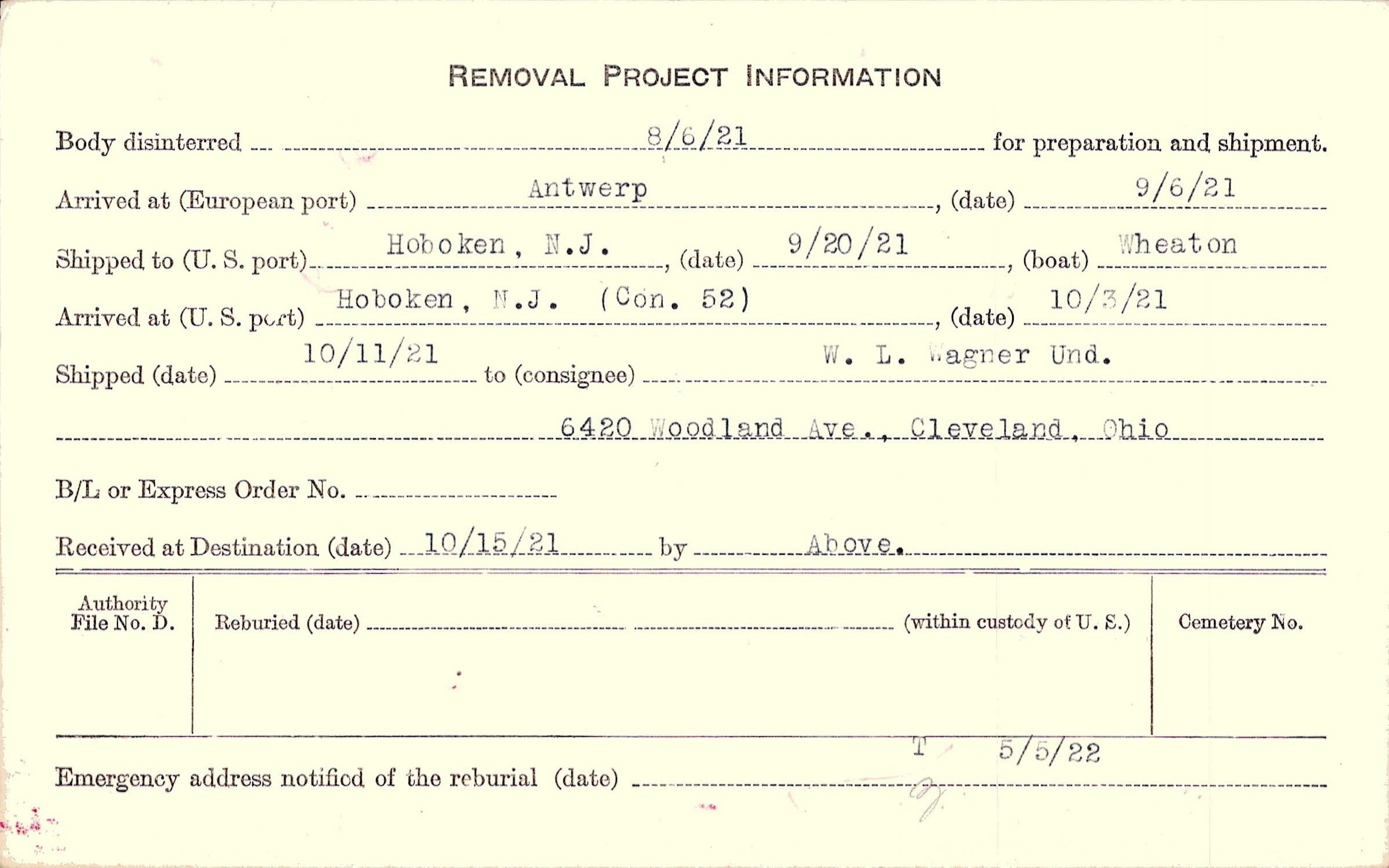 Body disinterred 8/6/1921 for preparation and shipment.