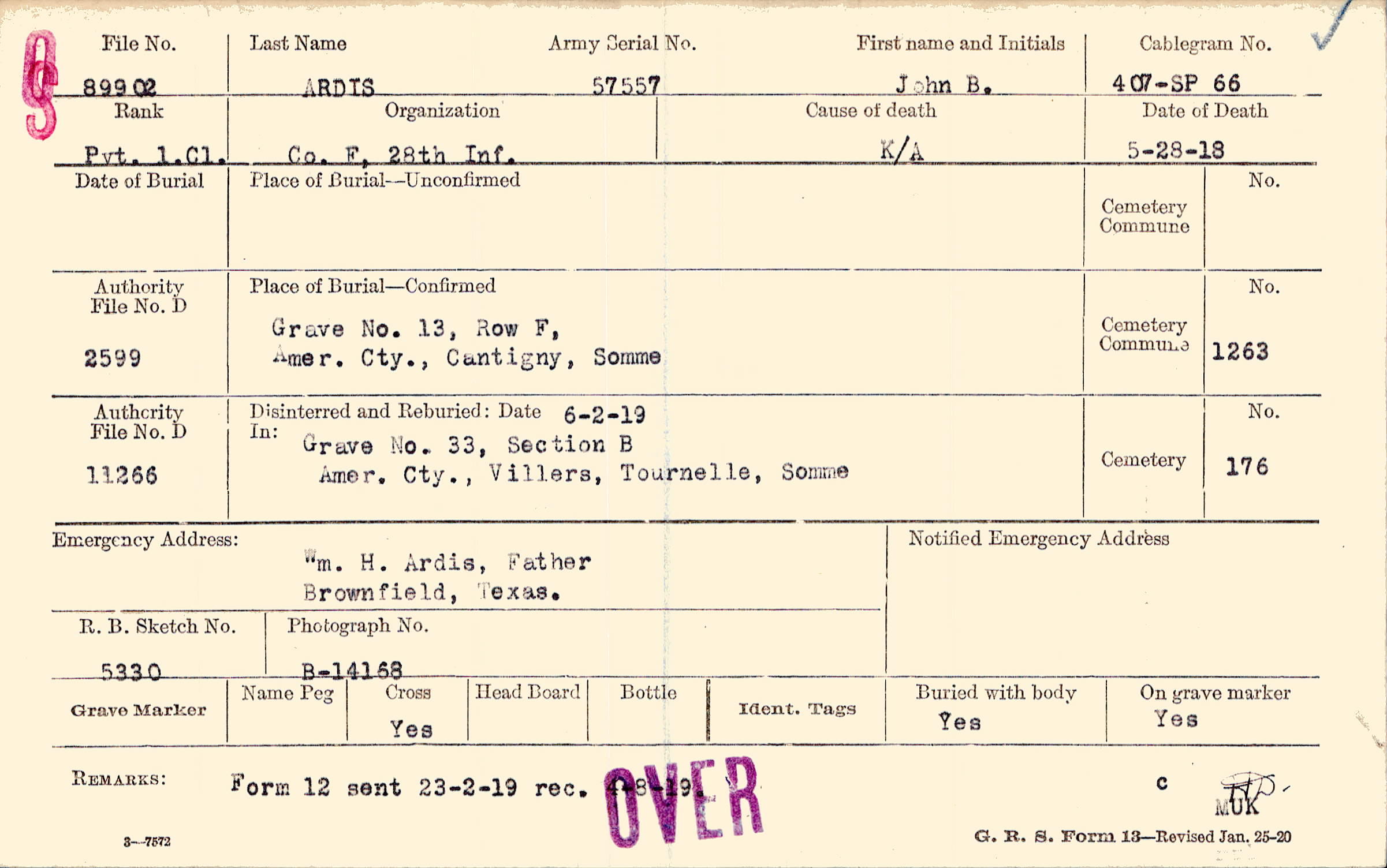 Grave 13, Row F, Amer. Cty., Cantigny, Somme