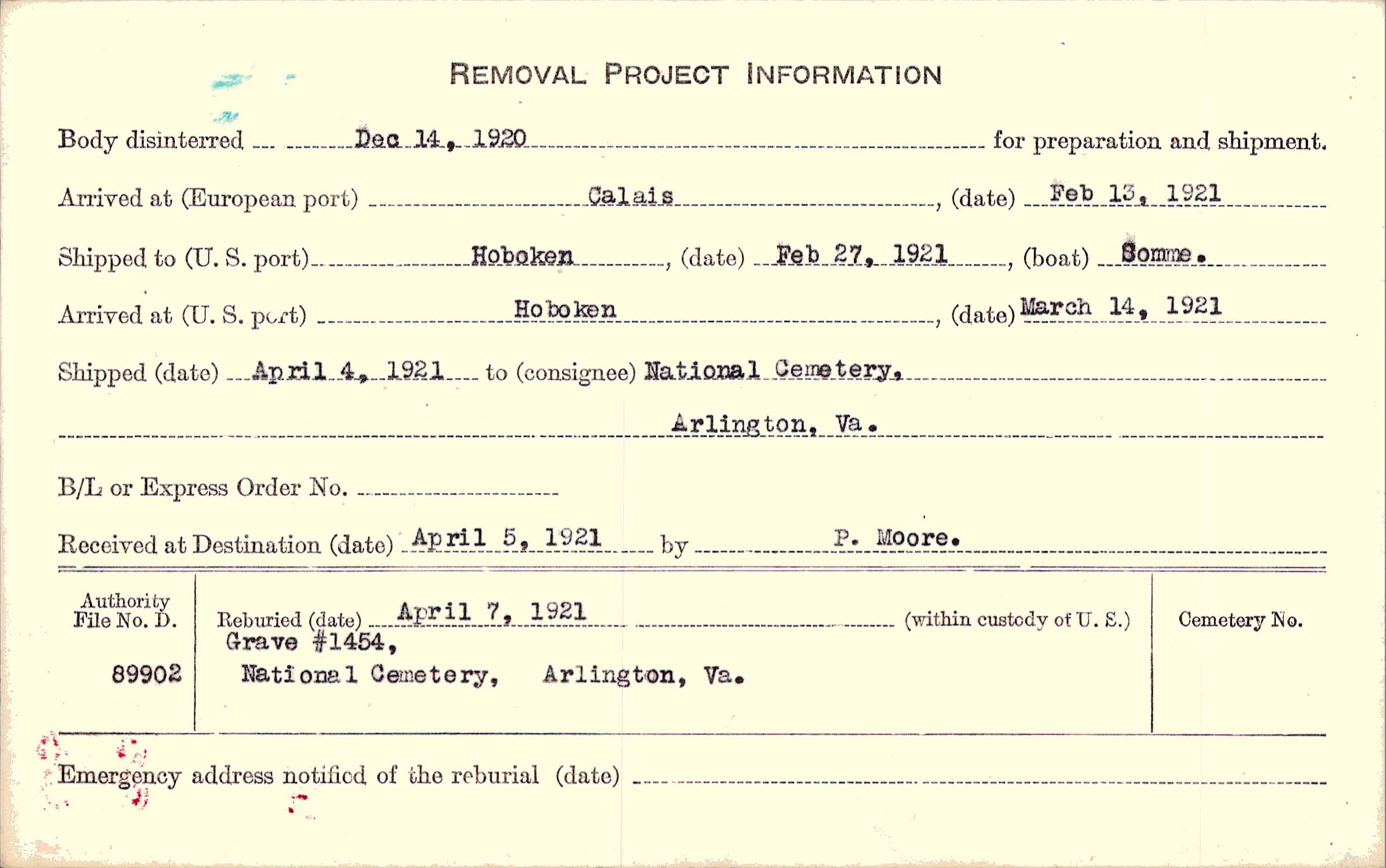 Body disinterred 12/14/1920 for preparation and shipment.