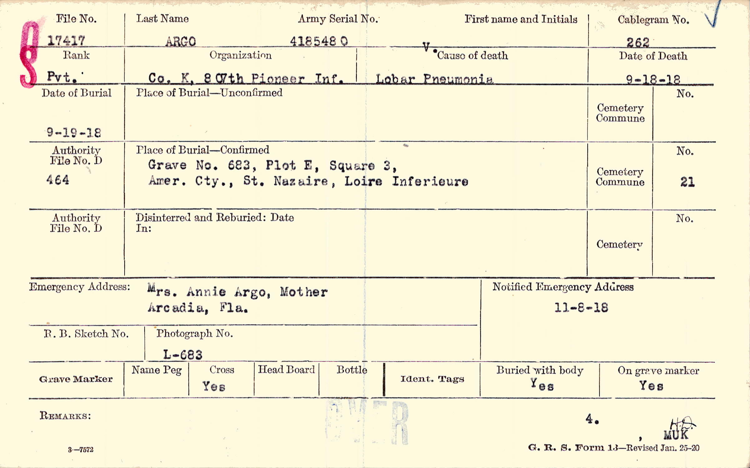Grave 683, Plot E, Square 3, Amer. Cty., St. Nazaire, Loire Inferieure
