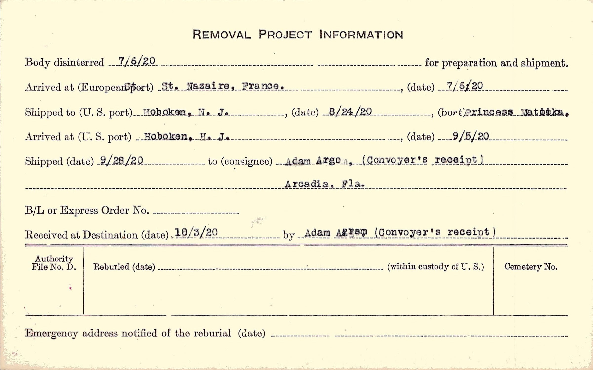 Body disinterred 7/6/1920 for preparation and shipment.