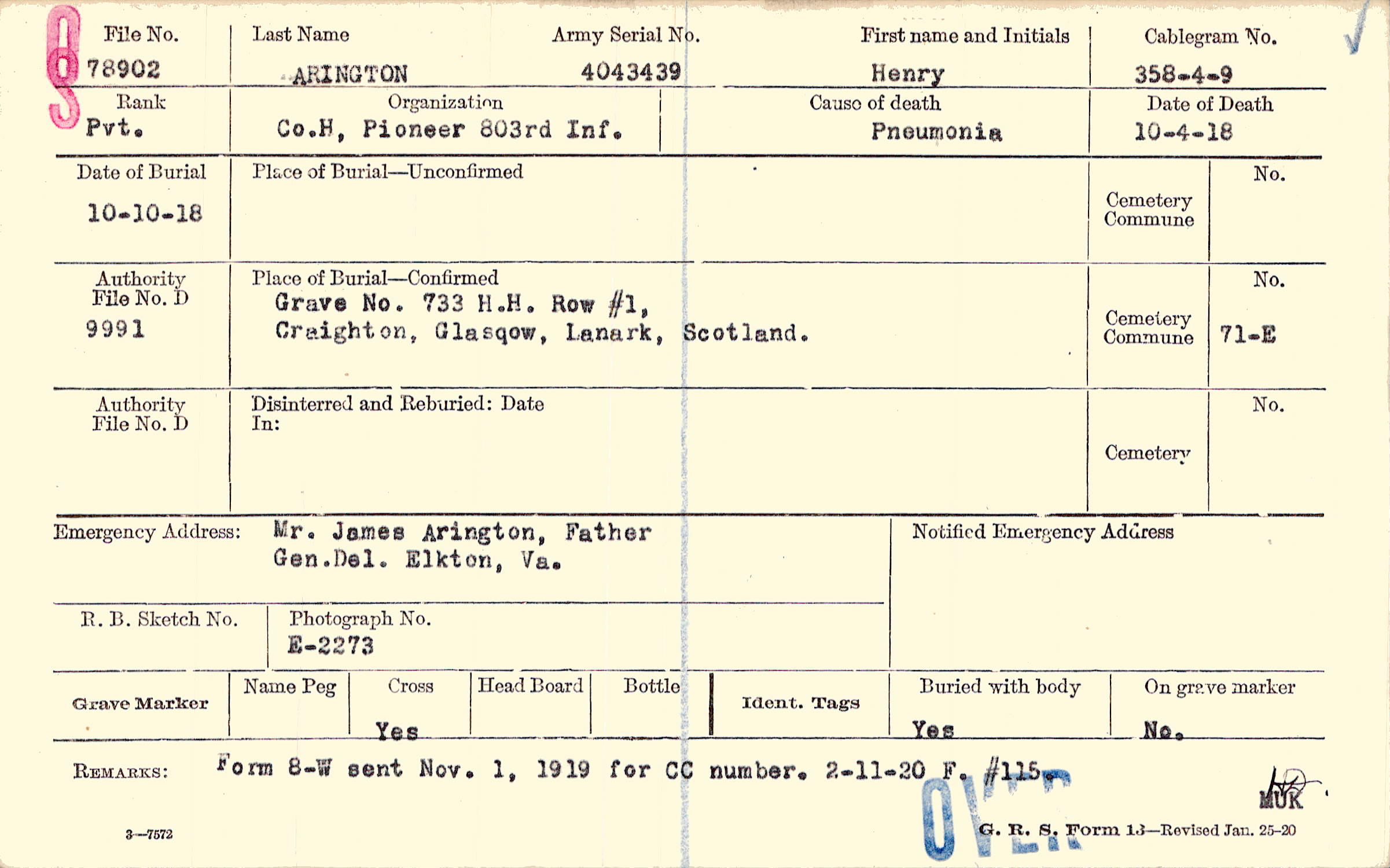 Grave 733, H.H. Row #1, Craighton, Glasgow, Lanark, Scotland