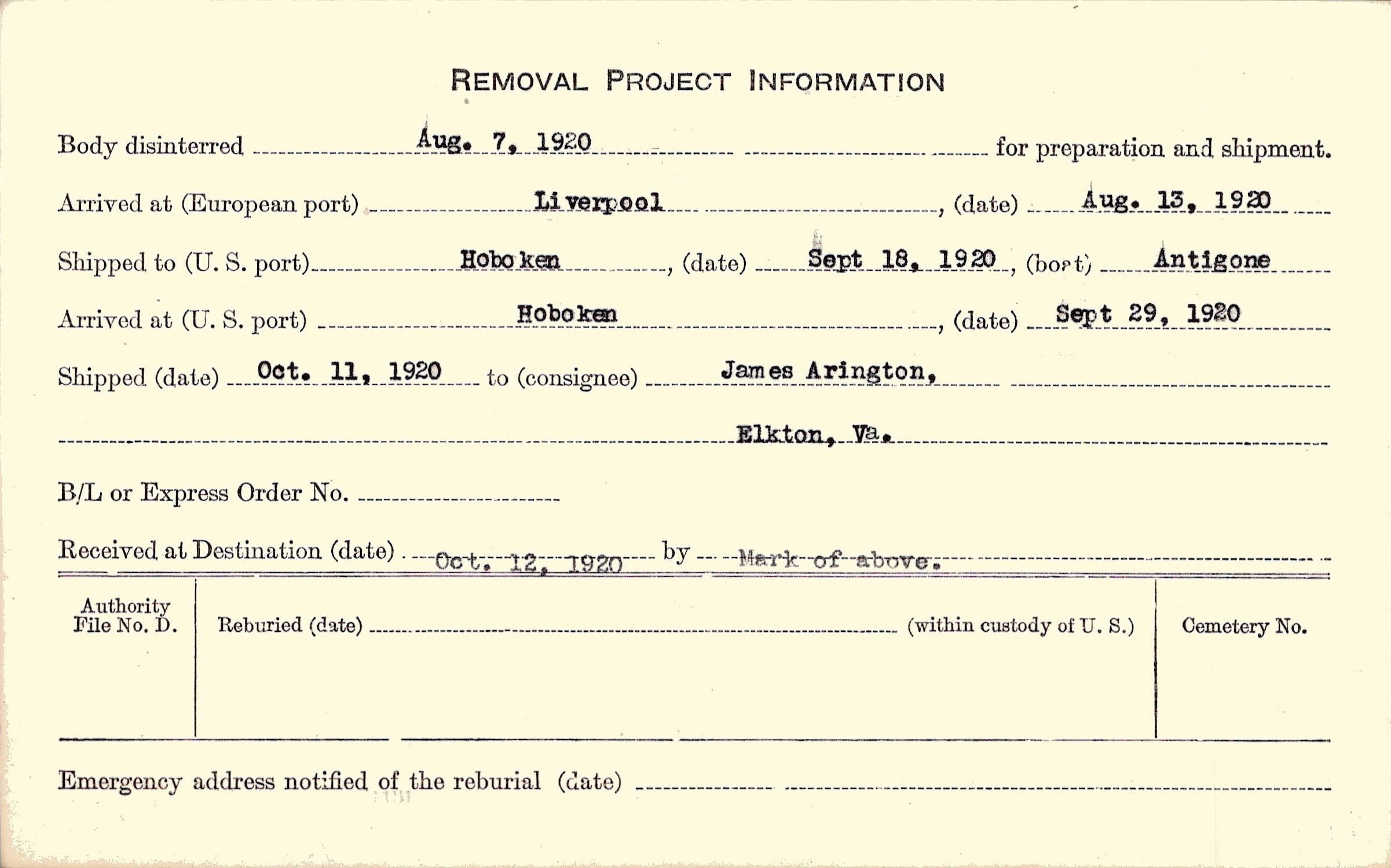 Body disinterred 8/7/1920 for preparation and shipment.