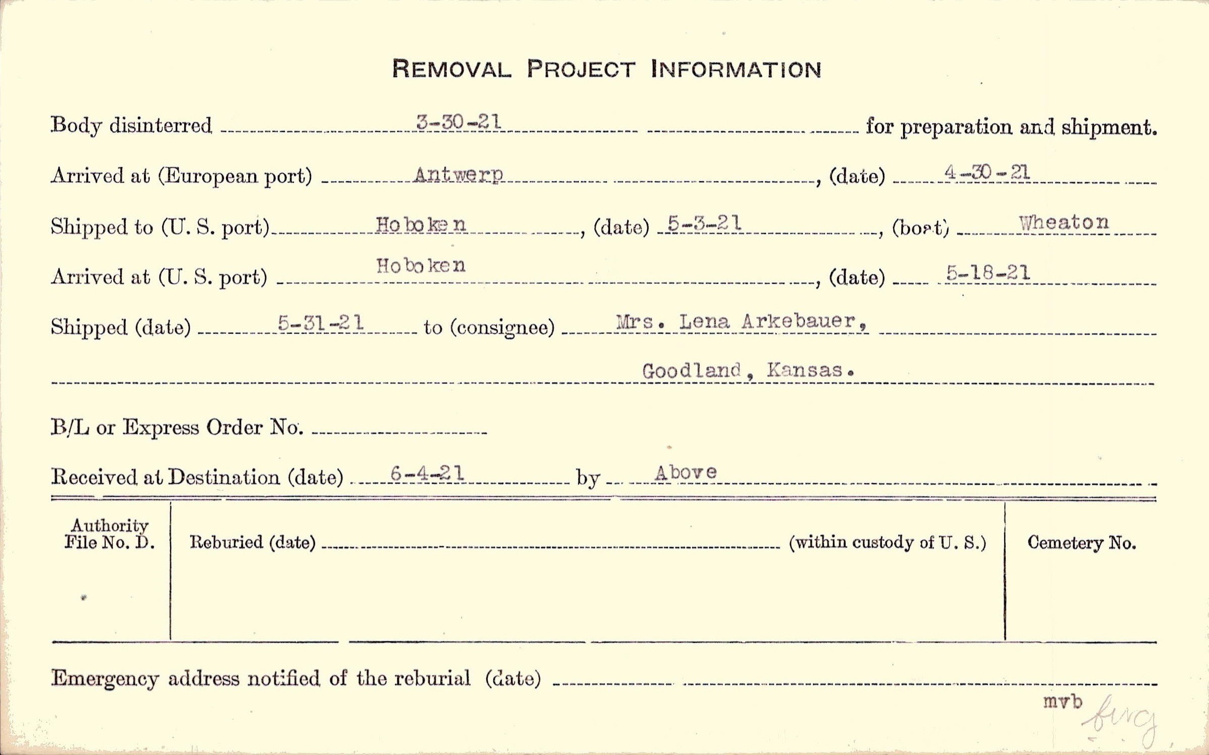 Body disinterred 3/30/1921 for preparation and shipment.