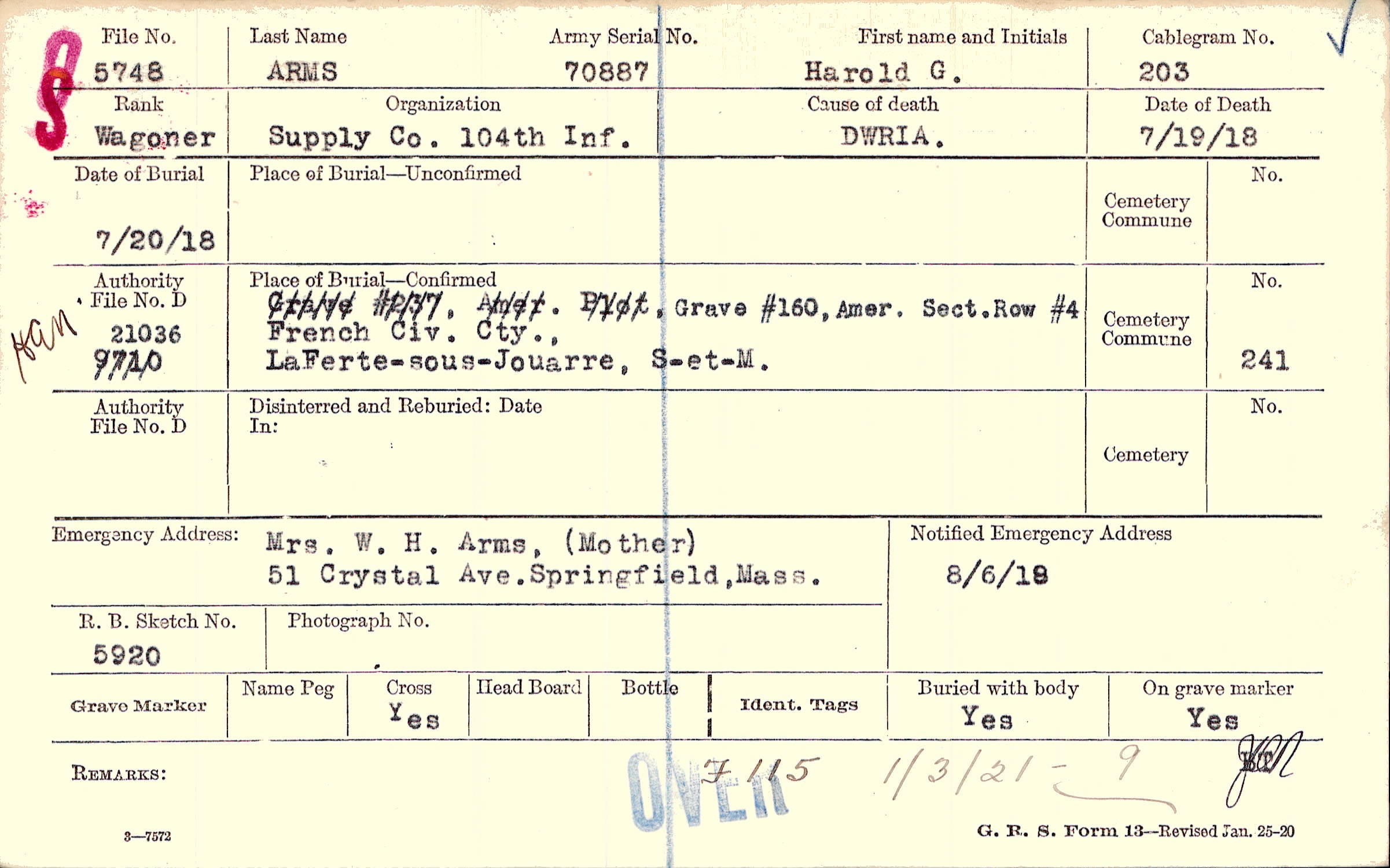 Mrs. W. H. Arms, (Mother), 51 Crystal Ave. Springfield, Mass.