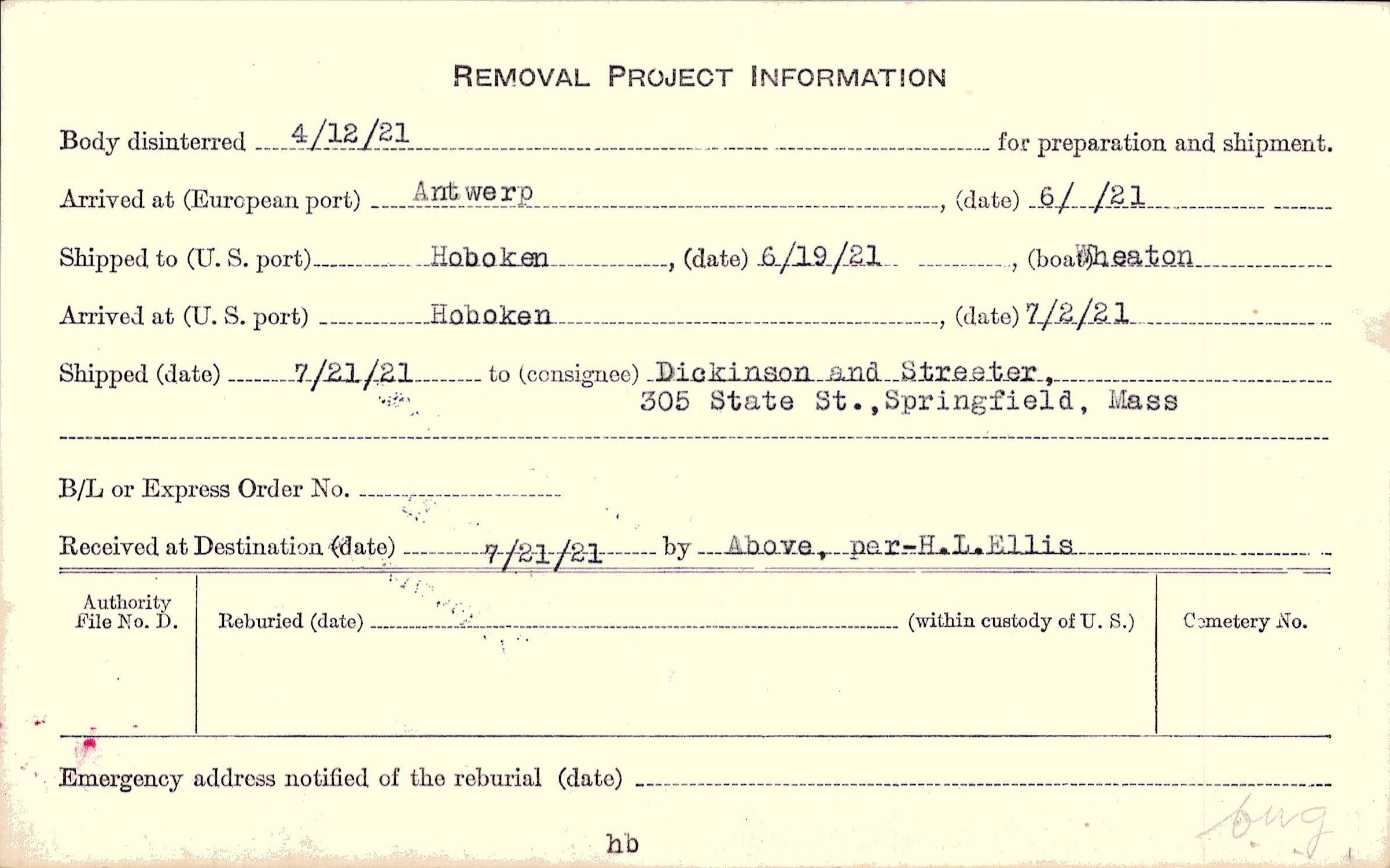 Body disinterred 4/12/1921 for preparation and shipment.