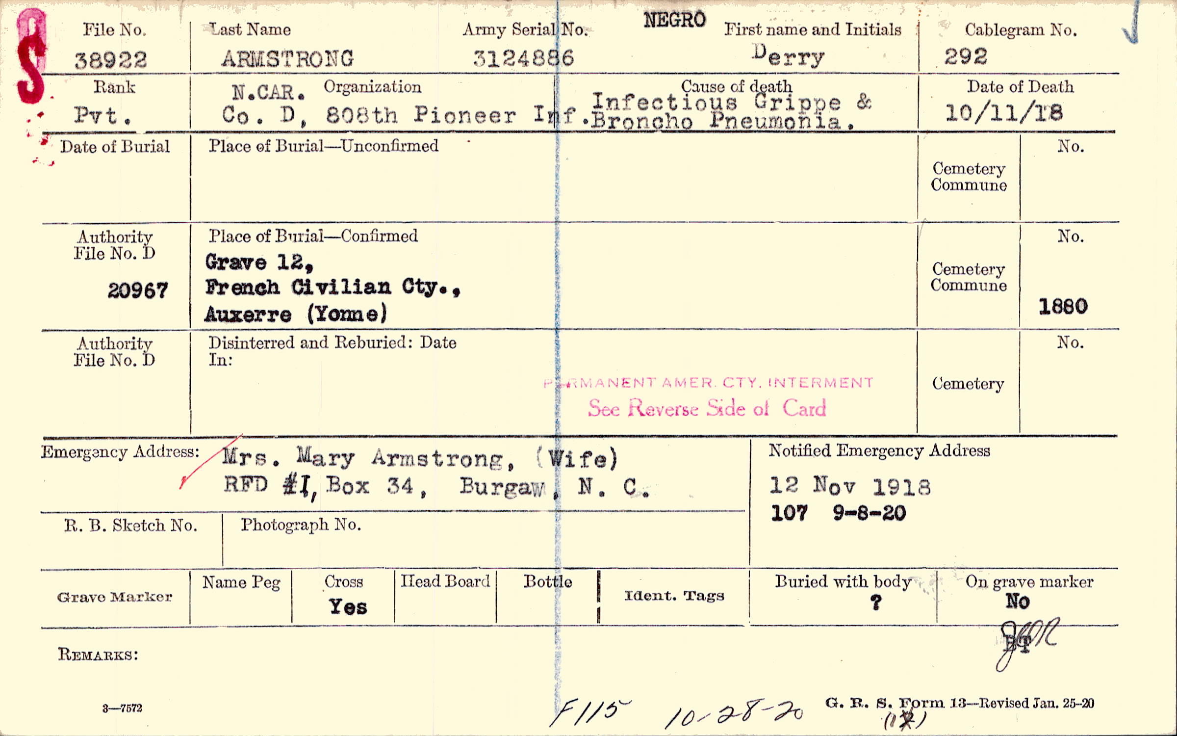 Mrs. Mary Armstrong, (Wife), RFD #1, Box 34, Burgaw, N. C,