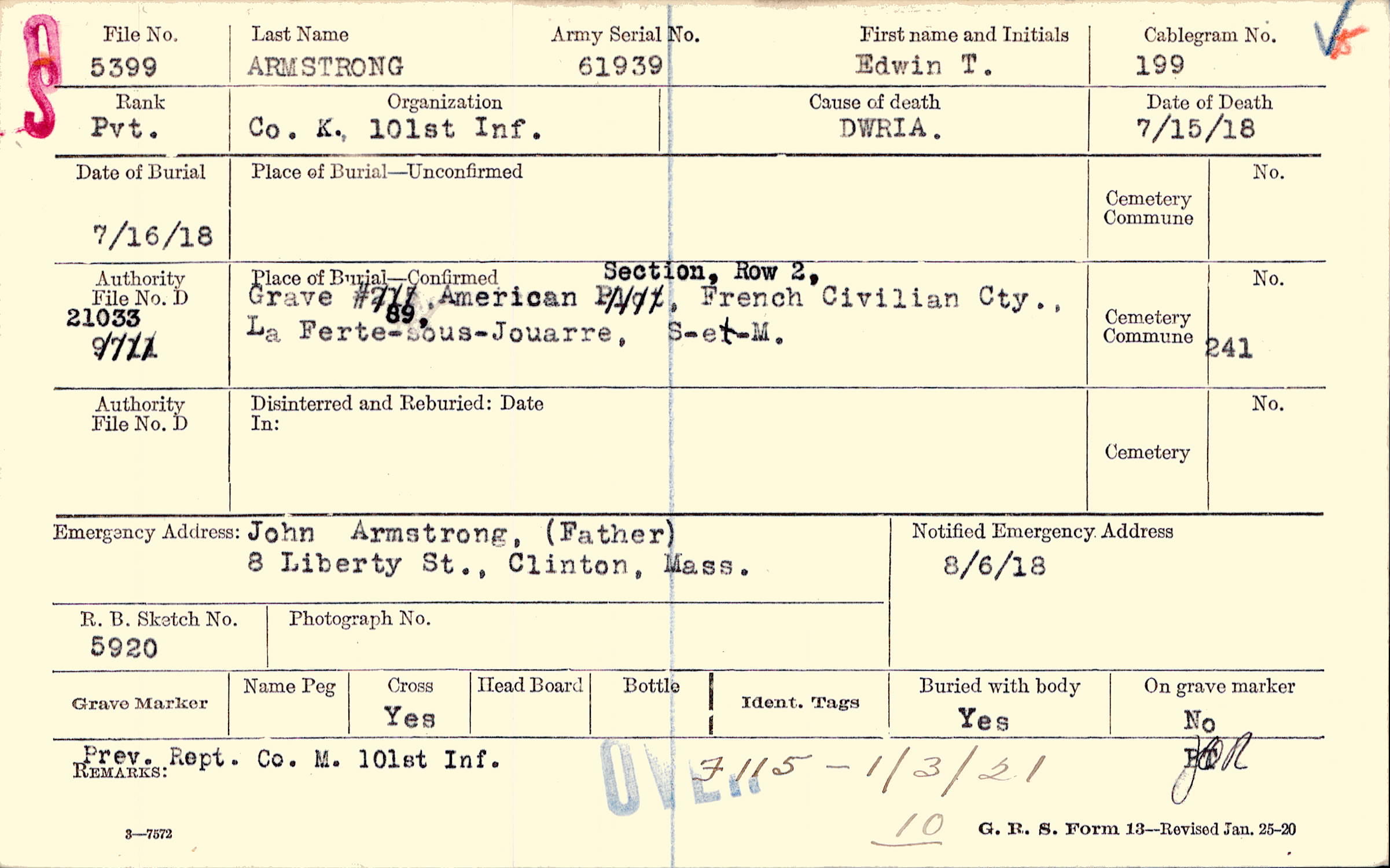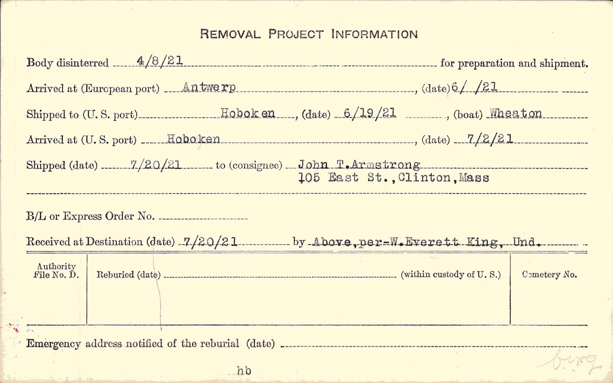 John Armstrong, (Father), 8 Liberty St., Clinton, Mass.