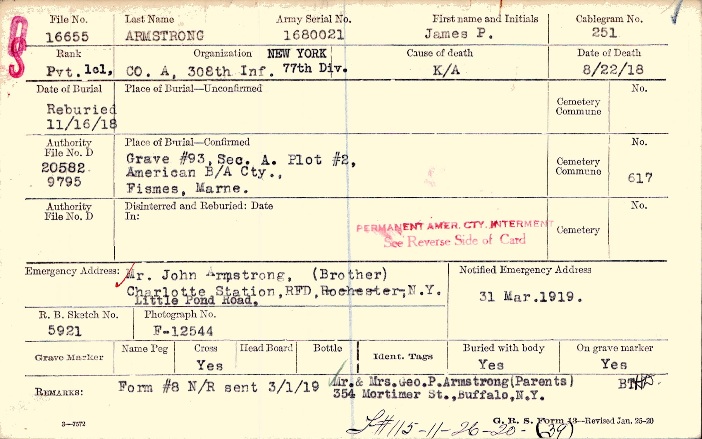 Mr. & Mrs. Geo. P. Armstrong, (Parents), 354 Mortimer St., Buffalo, N.Y., Form #8 N/R sent 3/1/19, F#115 = 11-26-20 - (39)