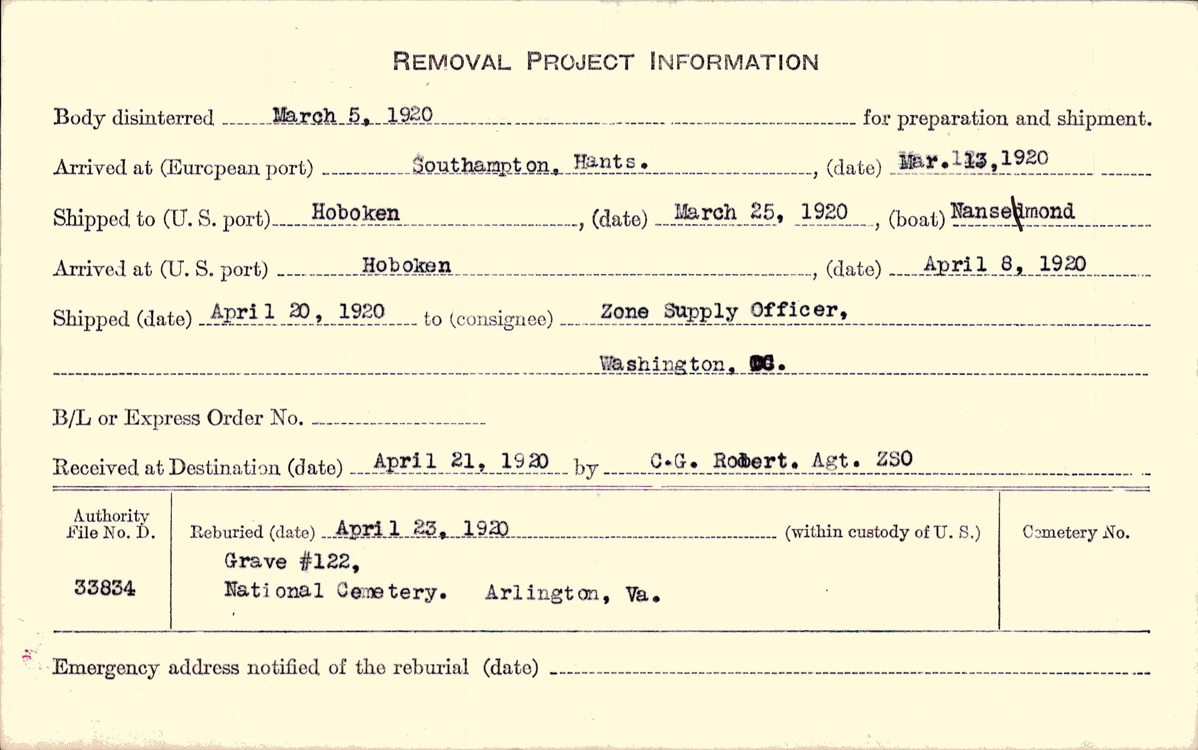 Body disinterred 3/5/1920 for preparation and shipment.