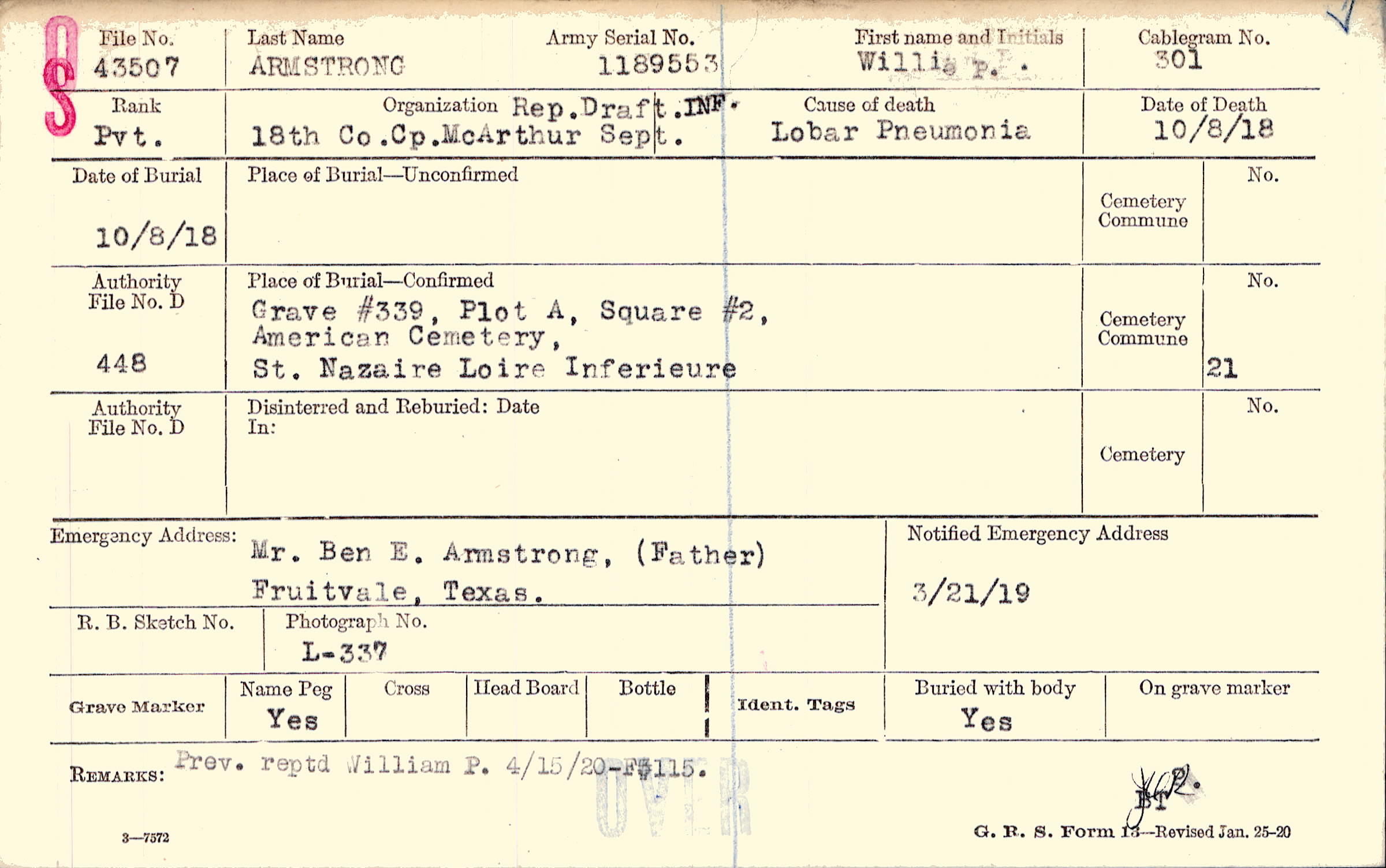 Grave #339, Plot A, Square #2, American Cemetery, St. Nazaire, Loire Inferieure