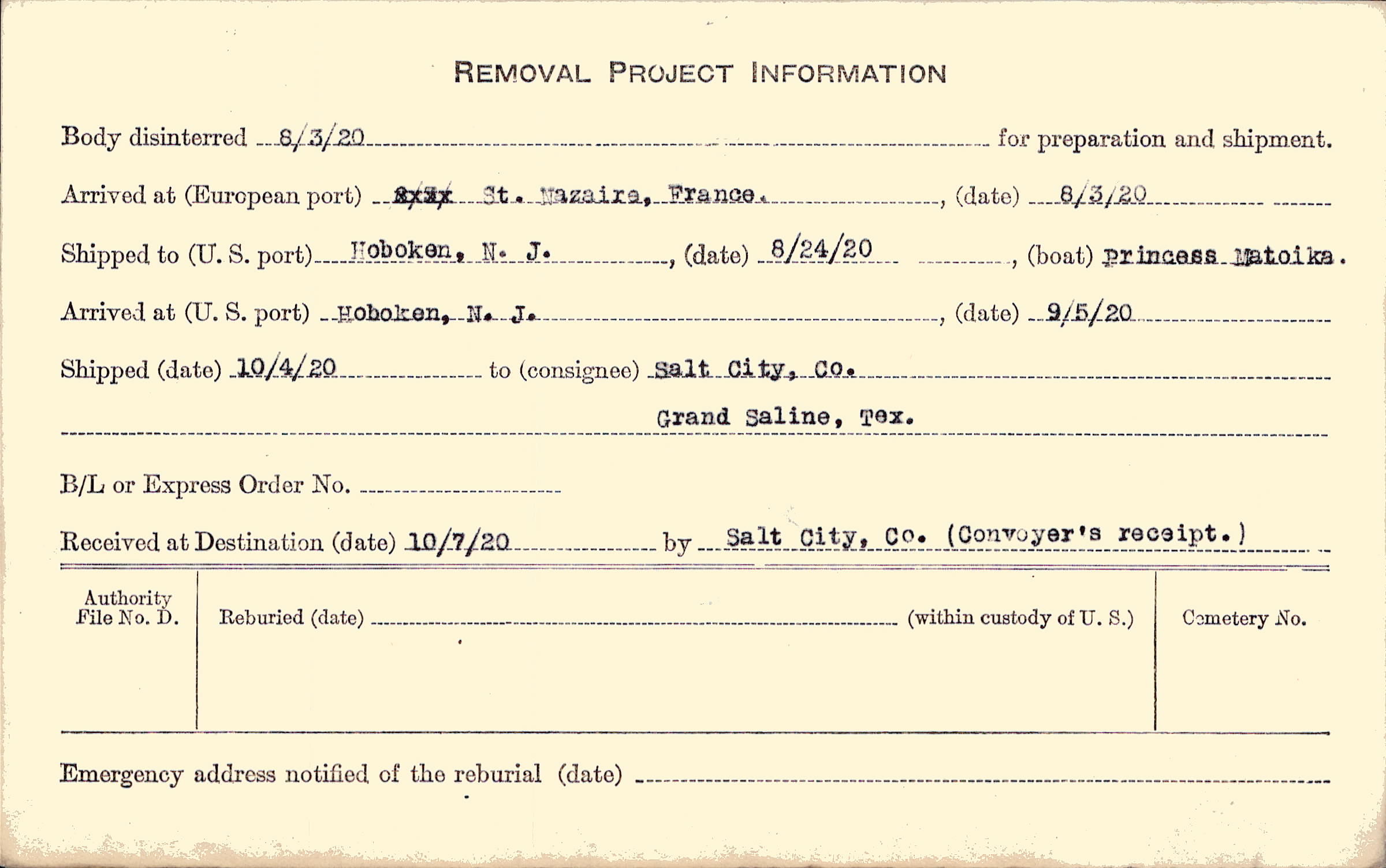 Body disinterred 8/3/1920 for preparation and shipment.