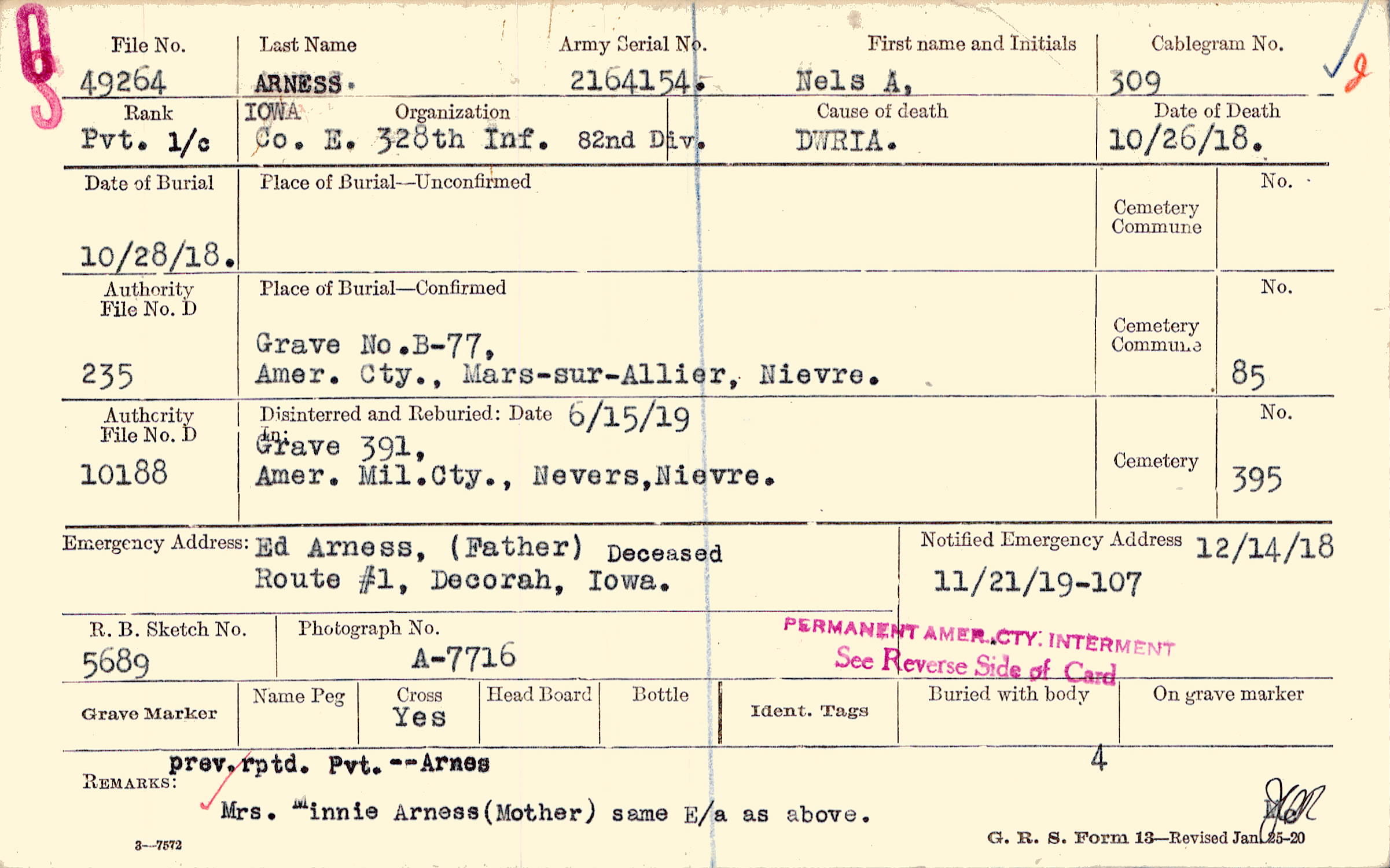 prev. rptd. Pvt. -- Arnes Mrs. Minnie Arness (Mother) same E/a as above.