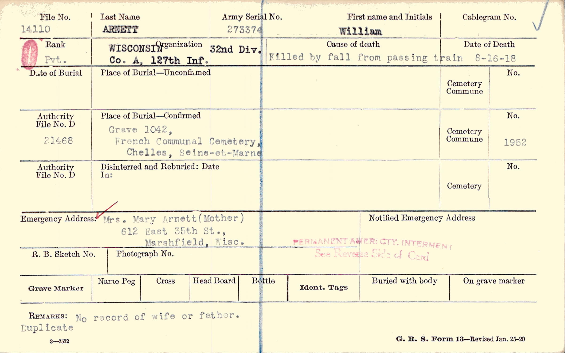 Mrs. Mary Arnett (Mother), 612 East 35th St., Marshfield, Wisc.