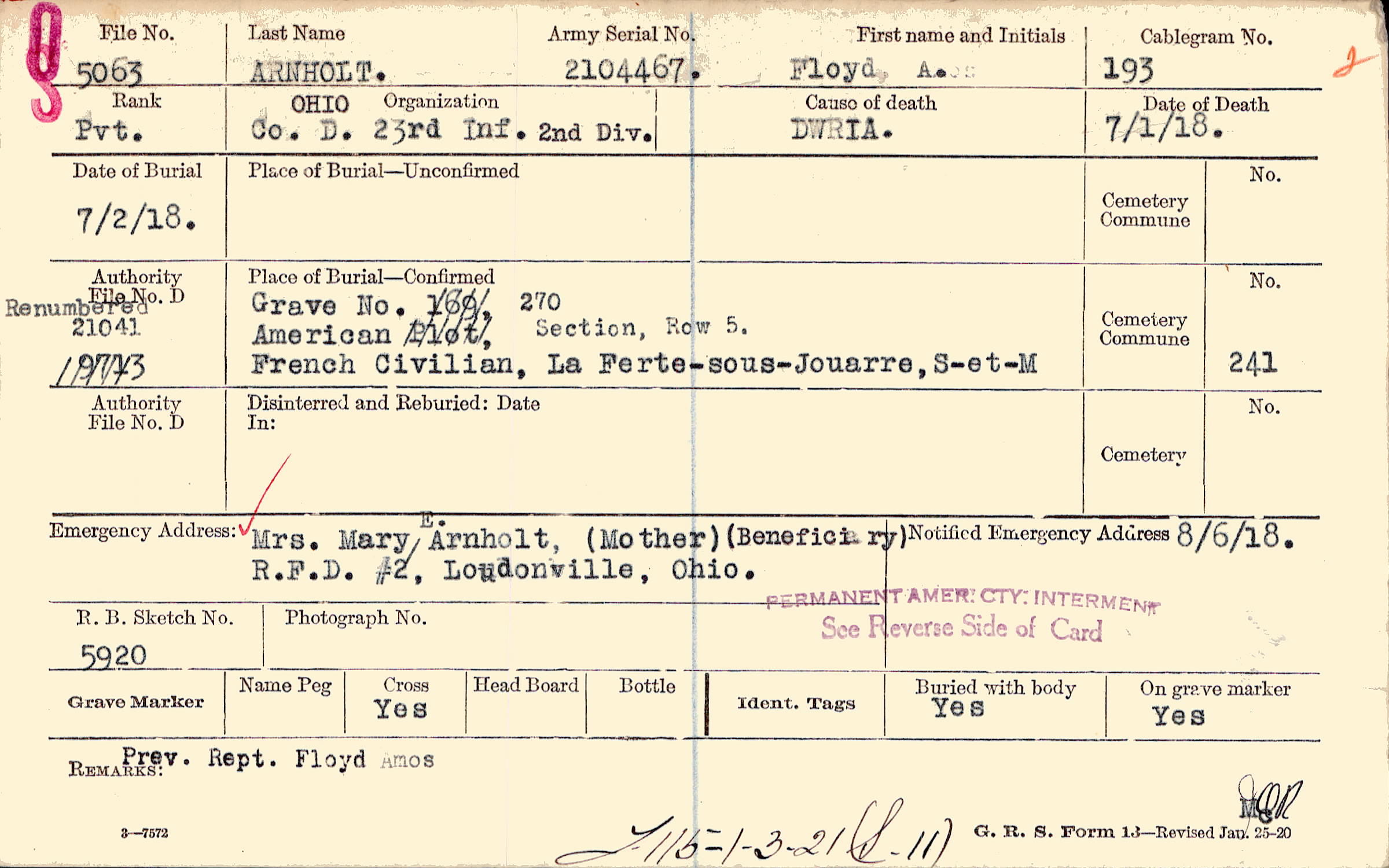 Mrs. Mary E. Arnholt, (Mother) (Beneficiary), R.F.D. #2, Loudonville, Ohio., E. (beneficiary)