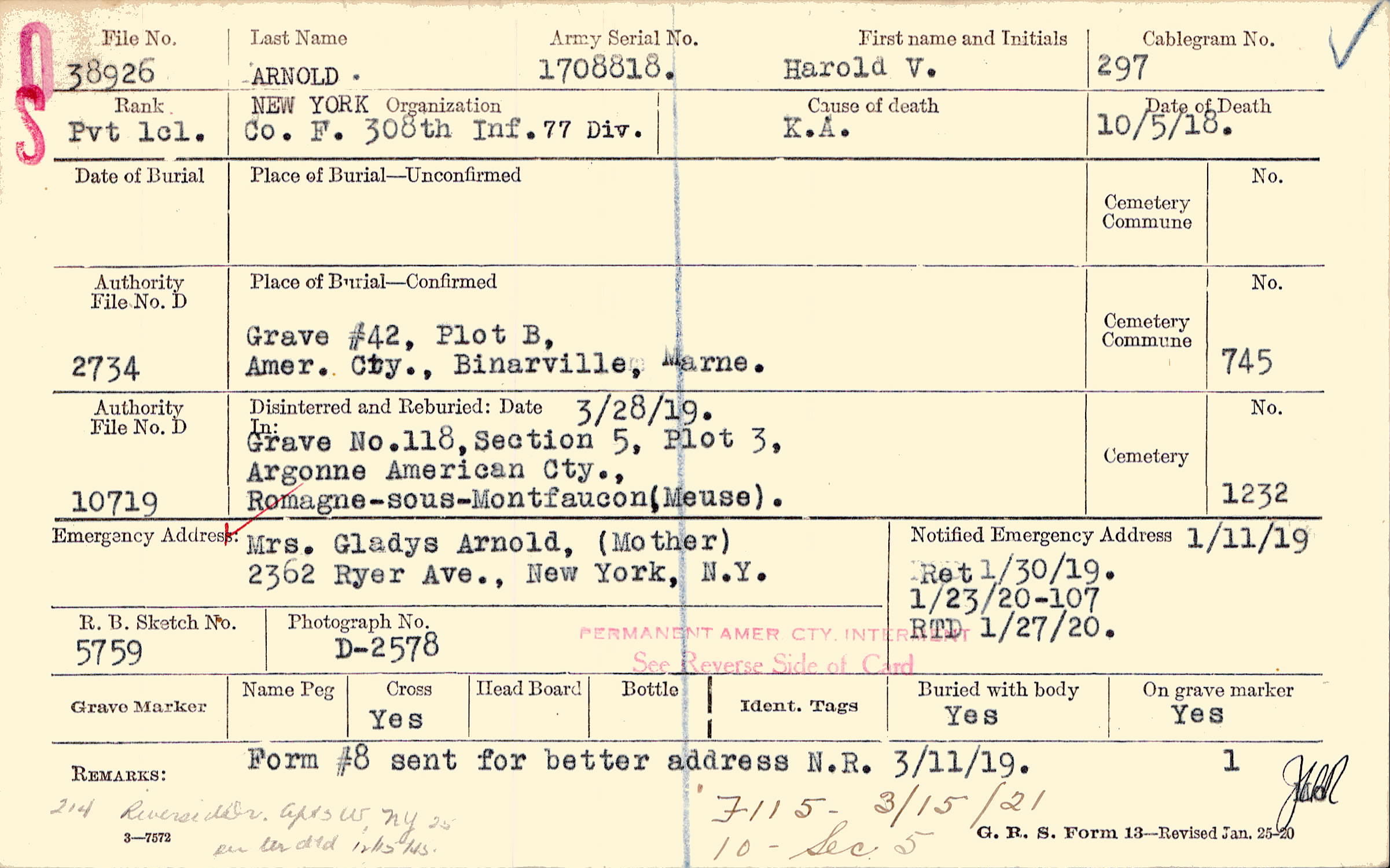 Mrs. Gladys Arnold, (Mother), 2362 Ryer Ave., New York, N.Y., Form #8 sent for better address N.R. 3/11/19