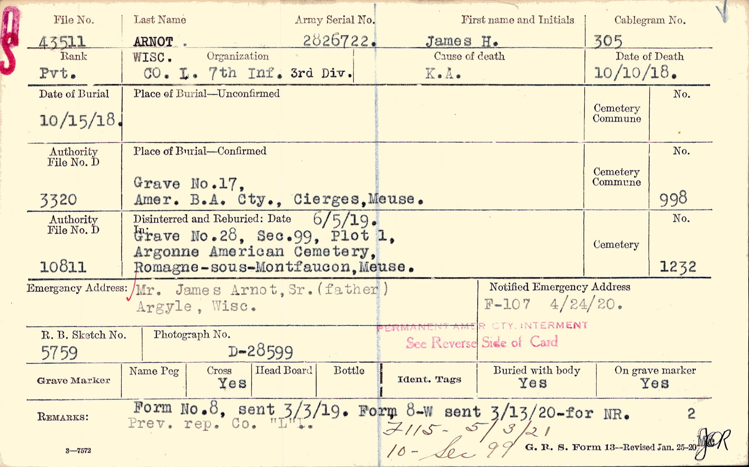 Grave 28, Section 99, Plot 1, Argonne American Cemetery, Romagne-sous-Montfaucon, Meuse