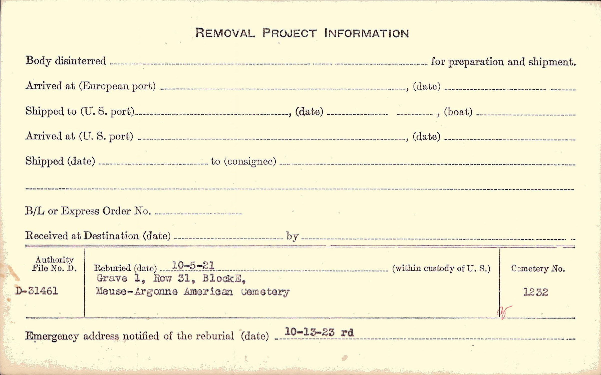 | Permanent Burial in Foreign Cemetery |