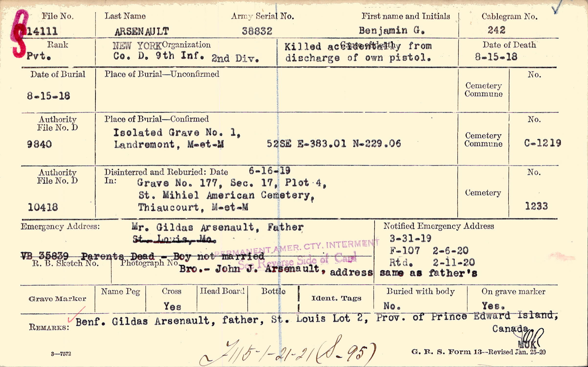 Mr. Gildas Arsenault, Father, VB 35839 Parents Dead - Boy not married Bro.- John J. Arsenault, address same as father's