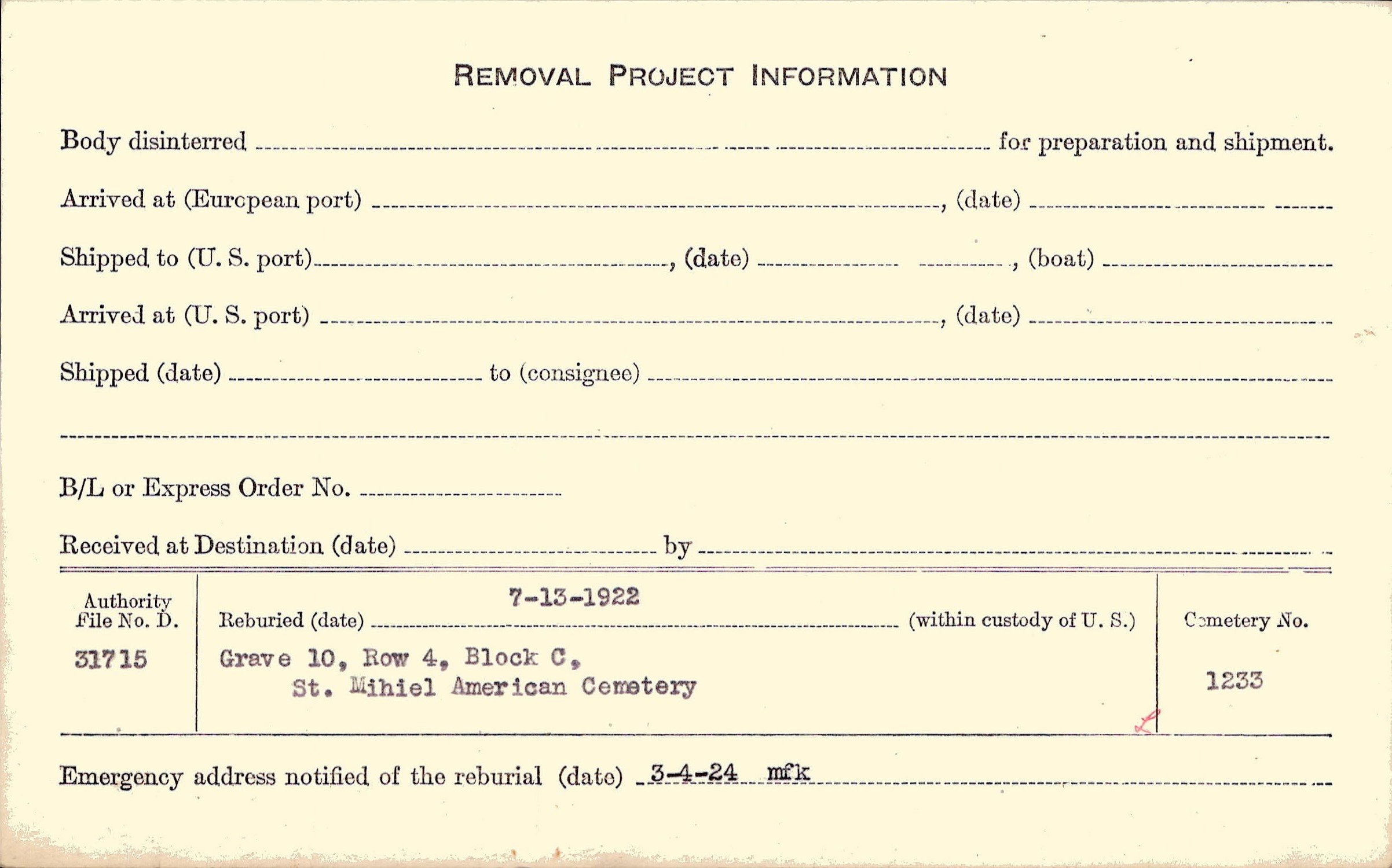 | Permanent Burial in Foreign Cemetery |